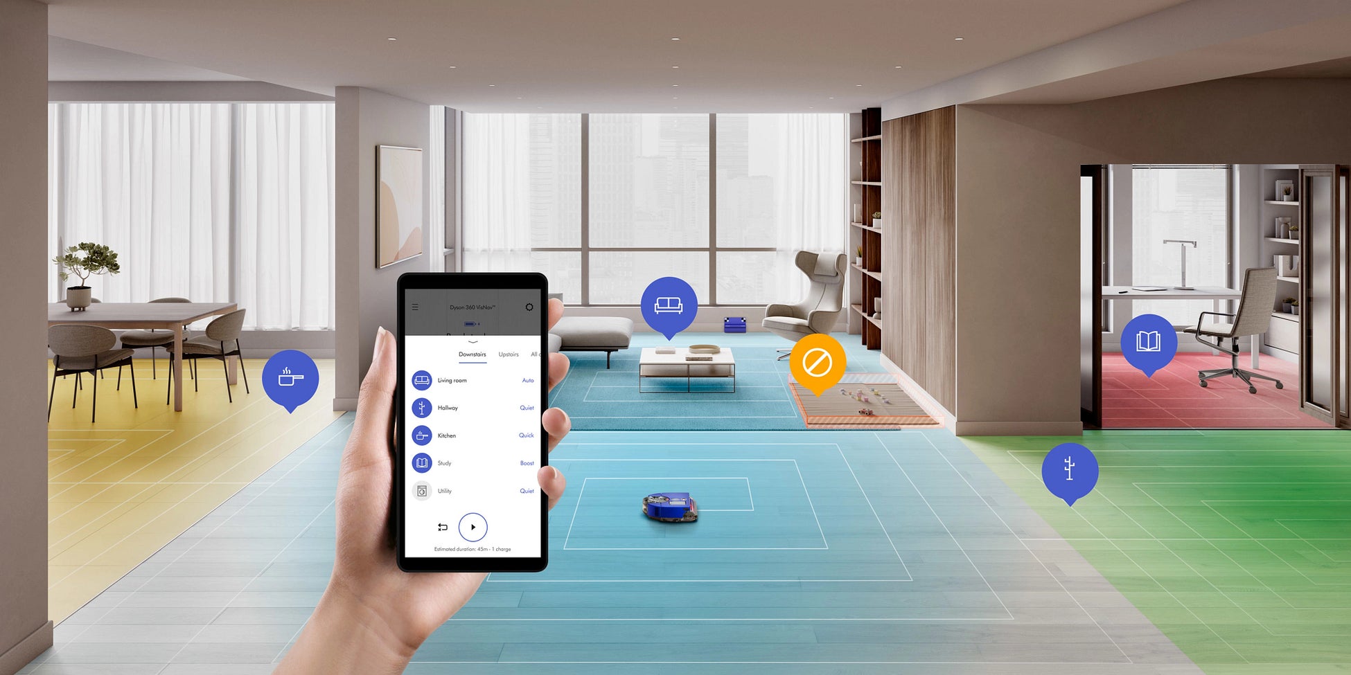 MyDyson™アプリで、どこからでも操作が可能*⁵。スケジュールの設定や運転モードの切り替え、制限エリアの設定、掃除後のディープクリーンレポートの確認などができます。また、各エリアを区切り、エリアごとの掃除のカスタマイズが可能です。