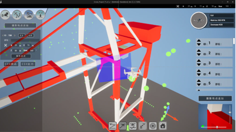「ドローンスナップ」は、点検前に3D空間上で点検対象に対する撮影設定と、飛行ルート生成・プレビューを行うことで、高度な設備点検を可能にするアプリケーションです。アプリに点検対象設備の3Dモデルや点群を読み込んで、3D空間でドローンの自動飛行ルートを作成します。ドローンに設置するカメラとも連動し点検時に必要とされるアングルで撮影設定が可能となります。