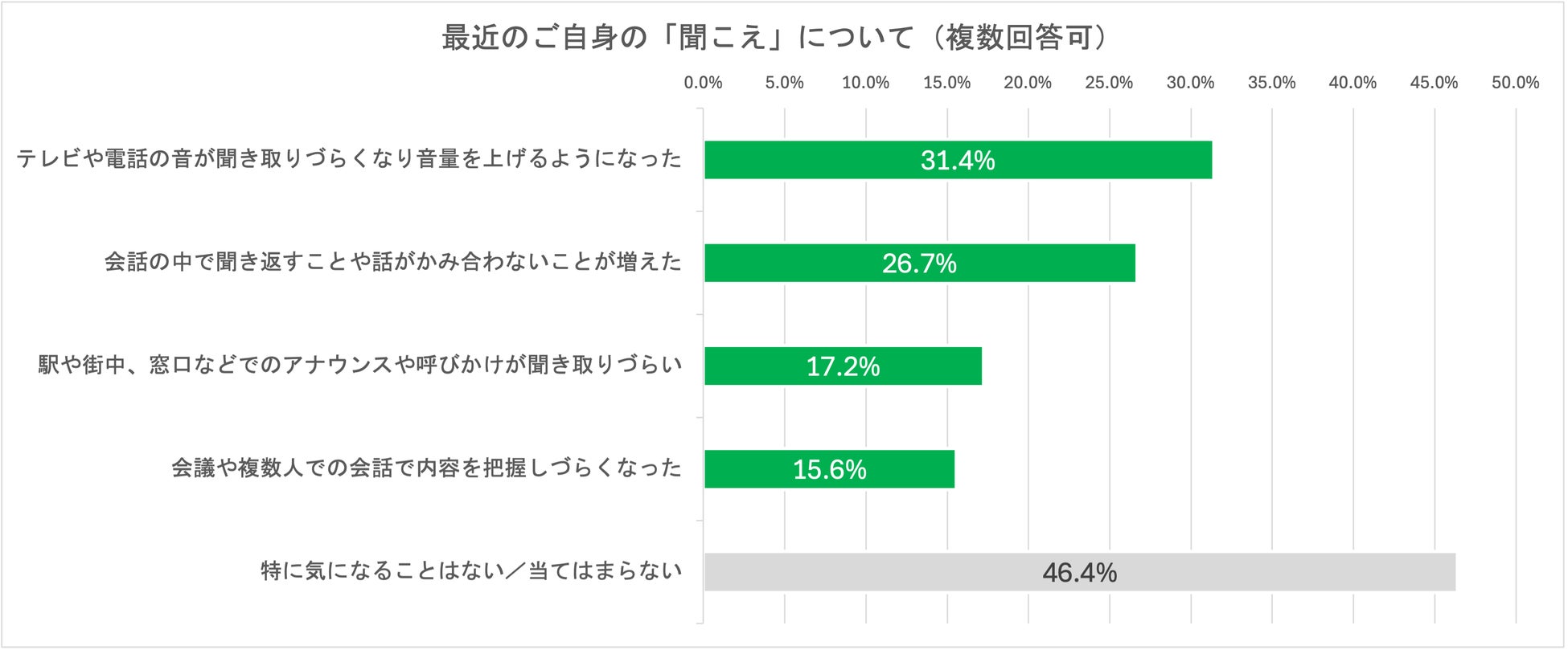 ・50代以上の方の約半数は「聞こえ」に課題感があり、1位は「テレビや電話の音が聞き取りづらくなり音量を上げるようになった」で3割