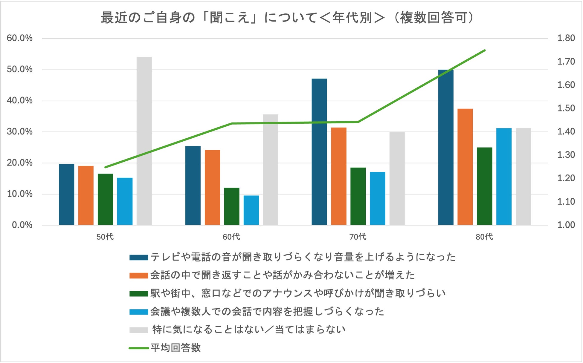 年代別に見ると、加齢とともに「聞こえ」に関する悩みを複数回答される割合が増えており、平均回答数も50代の1.25件から80代では1.75件まで上昇しています。特に60代以降は、「気になることはない/当てはまらない」と回答した割合が減少し、「聞こえづらさ」を実感する人が顕著に増えている様子がうかがえます。