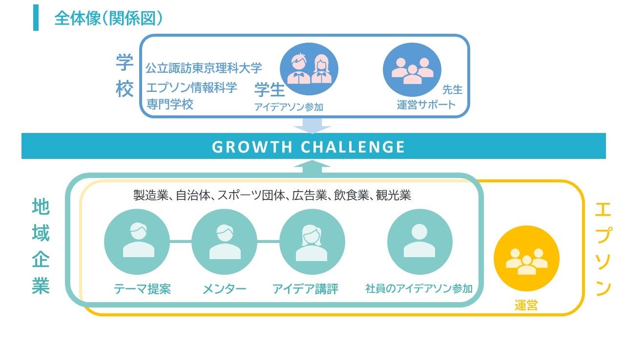 公立諏訪東京理科大学(学長:小越澄雄、長野県茅野市)、エプソン情報科学専門学校(学校長:小林 敏一、長野県諏訪市、以下 情報科学専門学校)、セイコーエプソン株式会社(代表取締役社長:小川恭範、長野県諏訪市、以下 エプソン)は、長野県諏訪エリアにおける学生・高等教育機関と自治体・企業を結ぶ新たなオープンイノベーションの場としてアイデアソン*を実施します。この取り組みを「GROWTH CHALLENGE」と名付け、地域社会や企業が抱える課題について、学生や自治体・企業がともに解決に向けてアイデアを出し、新しいビジネスモデルの創出に向けて身近な場で検証を行います。