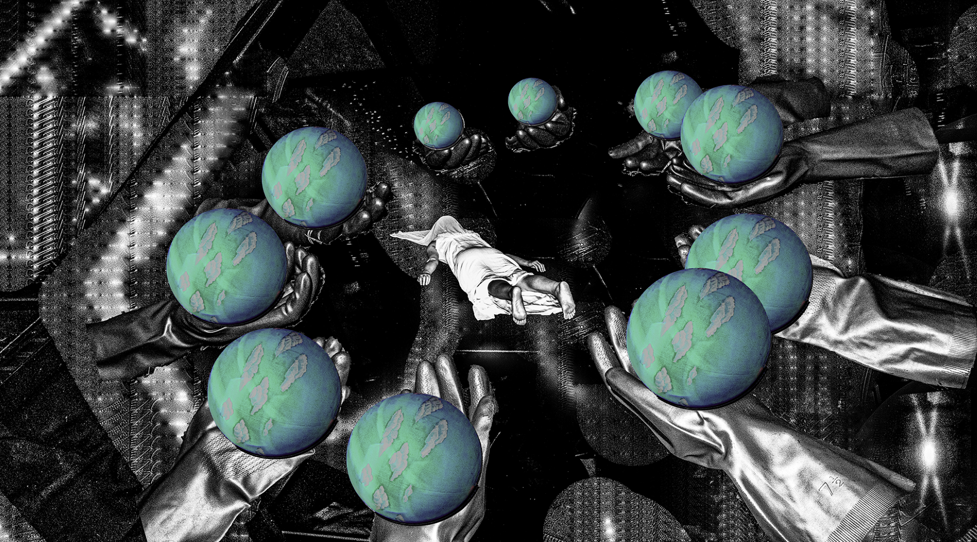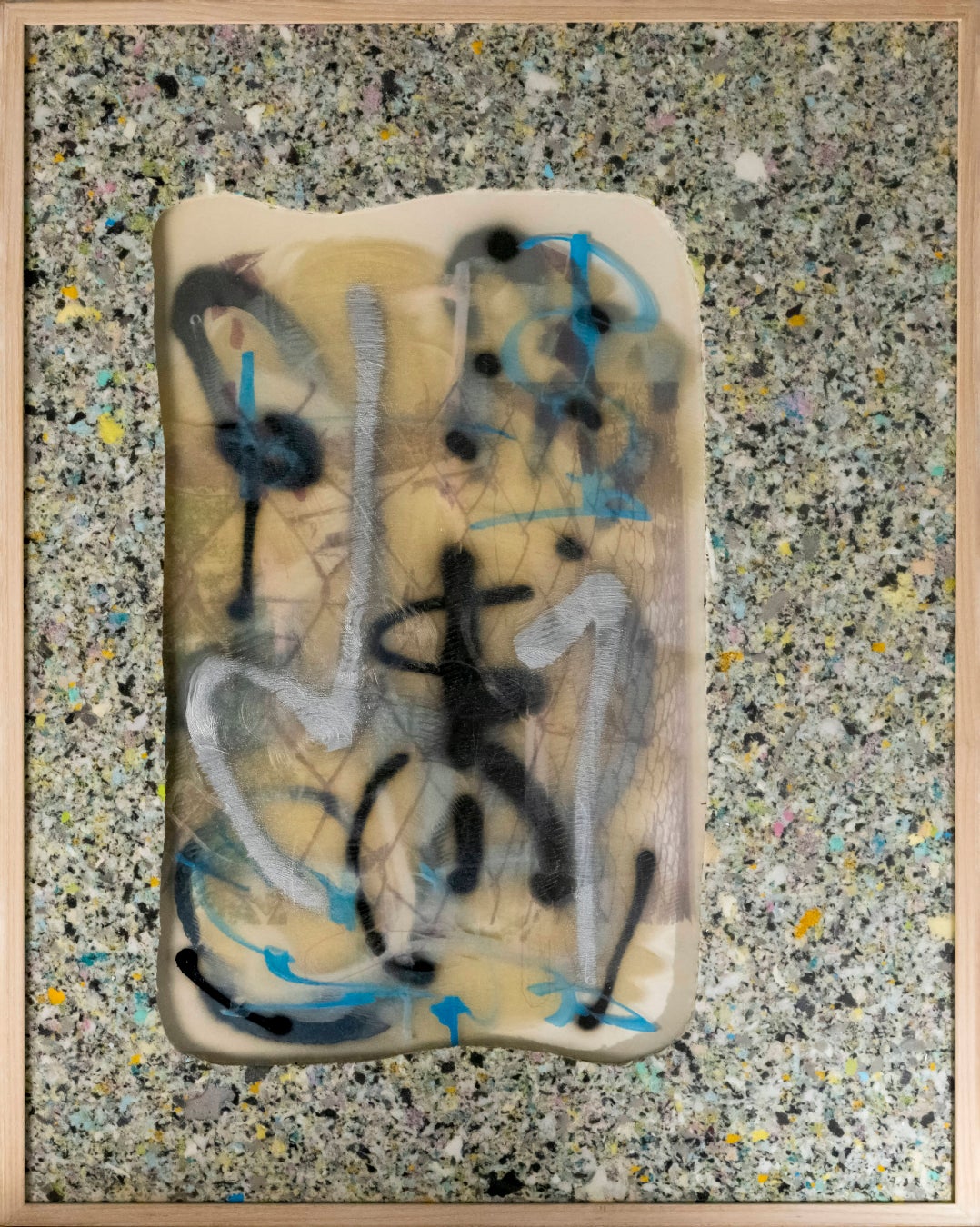 東城信之介は2019 年のVOCA展で最高賞となるVOCA賞受賞後、2021年に小海町高原美術館で個展を開催するなど、精力的に発表を続けています。普段の制作では、自身に内在するイメージを題材に、銅を酸化させた板に研削を加えてメタリックかつイリュージョニスティックな画面を創出しています。このたびのStareReap の作品では、アクリルに透明印刷をした支持体の上に、ペイントや加工を施したユニークピースを制作しました。プリントをあくまで素材として捉え、物質と絵画の両軸からStareReap を解釈しています。