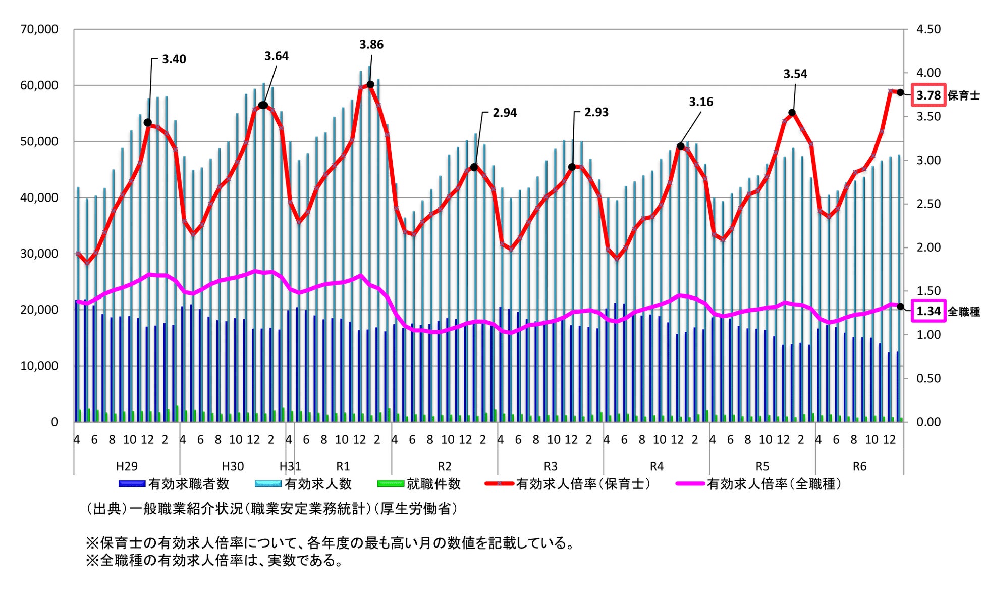 こども家庭庁の公表資料によると、保育士の有効求人倍率は3.78倍となっており、全職種平均の1.34倍と比べると高水準が続いています。都市部・地方を問わず多くの保育施設が人材確保に課題を抱えている状況です。