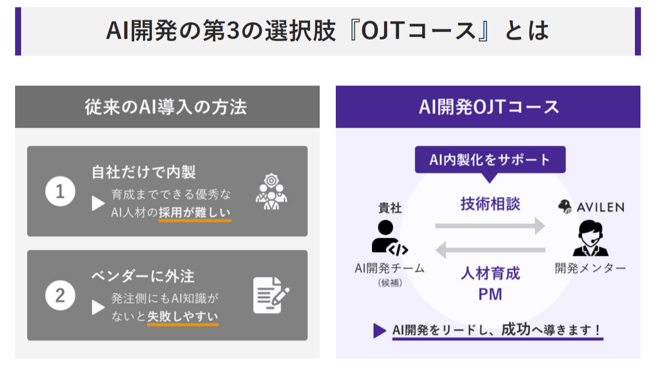 今回は、AI開発経験が豊富なAVILENのデータサイエンティストがメンターとなって、お客様社内のAI開発内製化を総合支援するサービス「AI開発OJTコース」のご紹介セミナーを開催します。