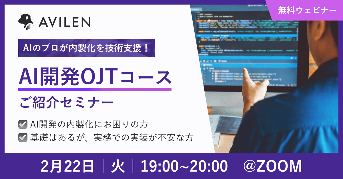 株式会社AVILEN(東京都中央区 代表取締役 高橋 光太郎)は、2022年2月22日(火)に『AIのプロが内製化を技術支援!AI開発OJTコースご紹介セミナー』を開催いたします。