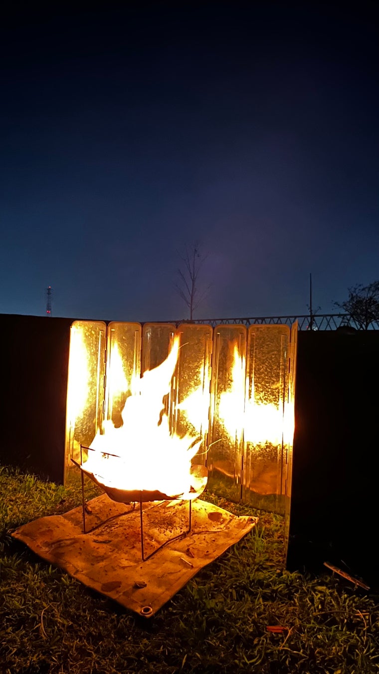 反射板 焚き火リフレクターを焚き火台の側面に設置することで、炎の熱や明かりを反射し、焚き火の恩恵をより広範囲で受けることができます。これにより、より暖かく過ごしたり、料理をより美味しくしたりすることができます。