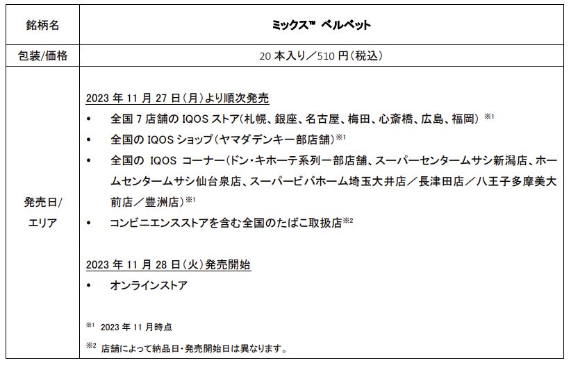 フィリップ モリス ジャパン合同会社(本社:東京都千代田区、社長:シェリー・ゴー、以下「PMJ」)は、KT&G製の煙の出ない加熱式たばこ機器「lil HYBRID™(リル ハイブリッド™)」専用たばこ製品「MIIX™(ミックス™)ベルベット」を2023年11月27日(月)から、全国7店舗のIQOSストア※、IQOSショップ(ヤマダデンキ一部店舗)、IQOSコーナー(ドン・キホーテ系列一部店舗)、コンビニエンスストアを含む全国のたばこ取扱店で、11月28日(火)からオンラインストアにて順次発売を開始いたします。
