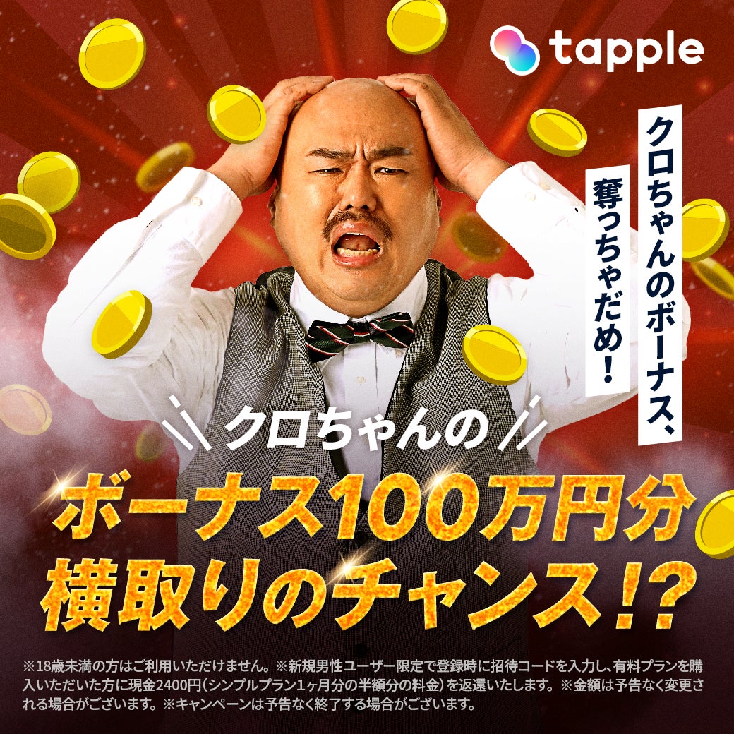 内容:クロちゃんとのコラボコンテンツ「ギャップでキュン質問」のリリースを祝して、期間中にコード「kurochan」を使ってタップルに登録・有料プランに加入した方に、クロちゃんへ用意したボーナス100万円のうち、2,400円分キャッシュバックする「クロちゃんのボーナス横取りキャンペーン」を実施します(1ヶ月プランを実質半額で利用可能)。余った分はクロちゃんにボーナスとしてお支払い。クロちゃんのボーナスを横取りしちゃおう!