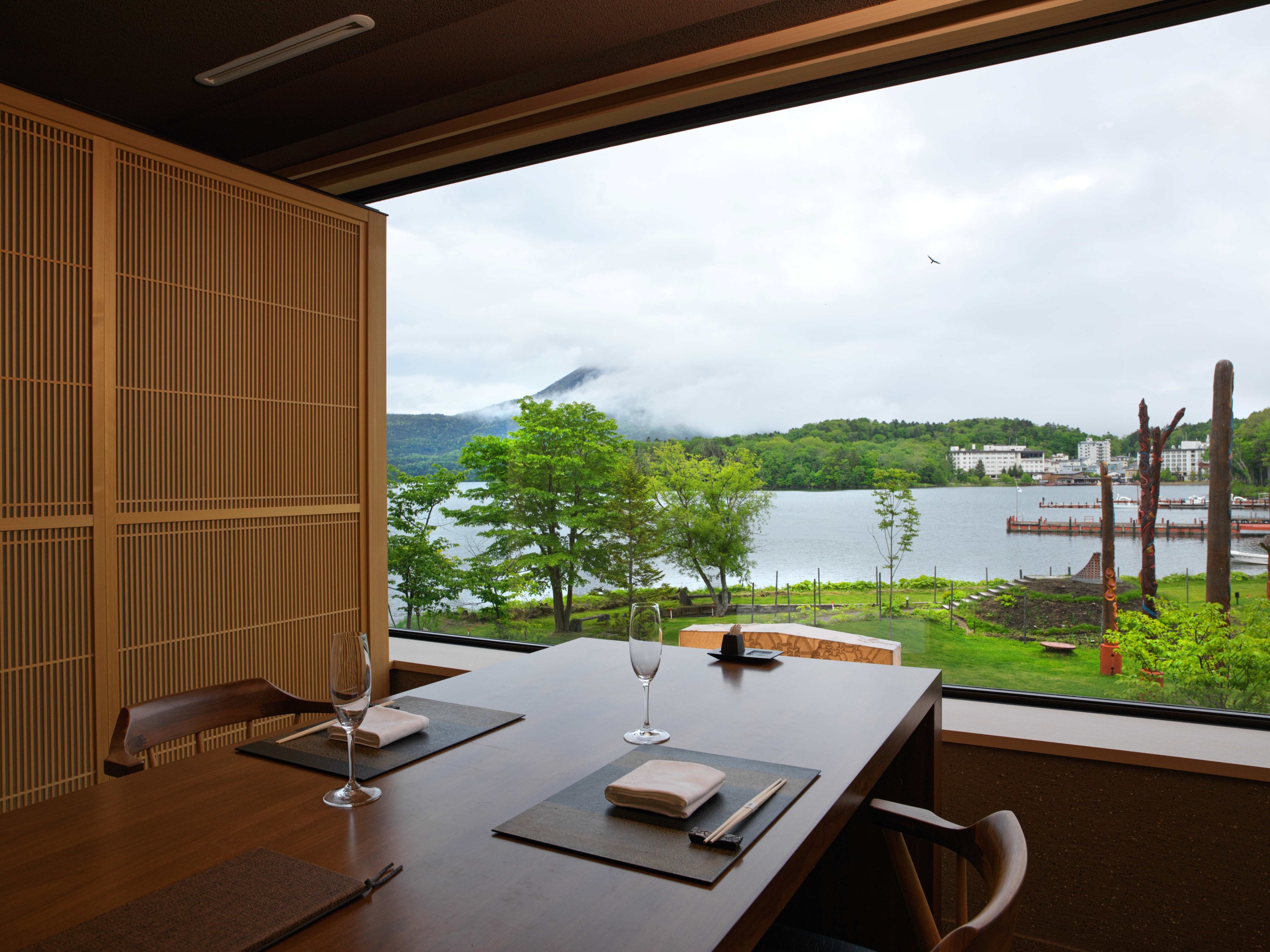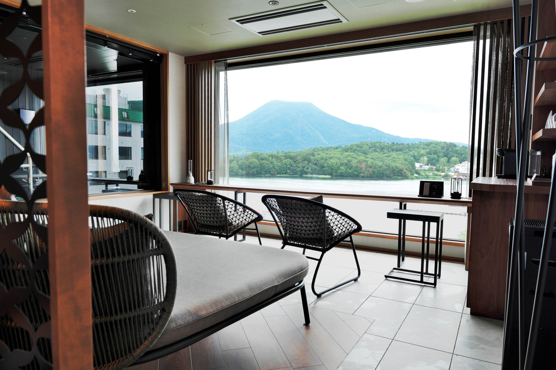 「プレジデンシャルスイート 秋霜」は、270平米の広さを誇る2フロアのメゾネットタイプ。客室からは阿寒湖と雄阿寒岳を一望でき、その眺望はまるで一枚の風景画のようです。室内は優しく上品な色調をベースに木のぬくもりとアイヌデザインを活かした意匠が施され、釧路市出身の書道家 加藤秋霜氏の書が空間に調和を与えています。7階にはリビング、ダイニング、ミニバー、寝室を、8階には寝室、展望浴室、サウナ、リラクゼーションルームを完備。阿寒湖の大自然と伝統文化に包まれ洗練された空間と上質を表現した和モダンが融合し、贅沢な滞在をご堪能いただけます。