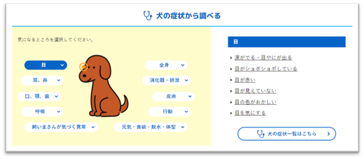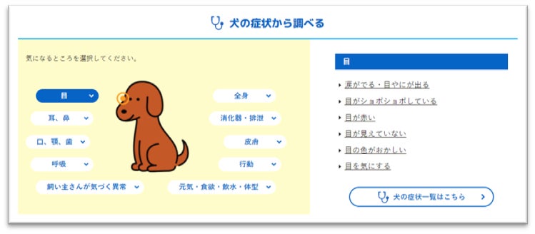 「うちの子 HAPPY PROJECT」は、「今日から実践でき、すぐに役立つ犬や猫の病気・事故対策」を当社の獣医師がリアルな数字やイラストなどを交え、わかりやすく解説するコンテンツです。今回新たに公開した『うちの子おうちの医療事典』は、獣医師が監修した250以上の代表的な傷病情報から、犬・猫に関する知りたい「病名」や「症状」などを一括で検索できるデータベースです。「フリーワード」から検索できるほか、「病名」や体の「部位」、「症状」からも検索が可能です。“かゆみがあるけどどんな病気が疑われるの?”“目にまつわる病気が知りたい!”などの飼い主さまの疑問にお役立ていただけます。