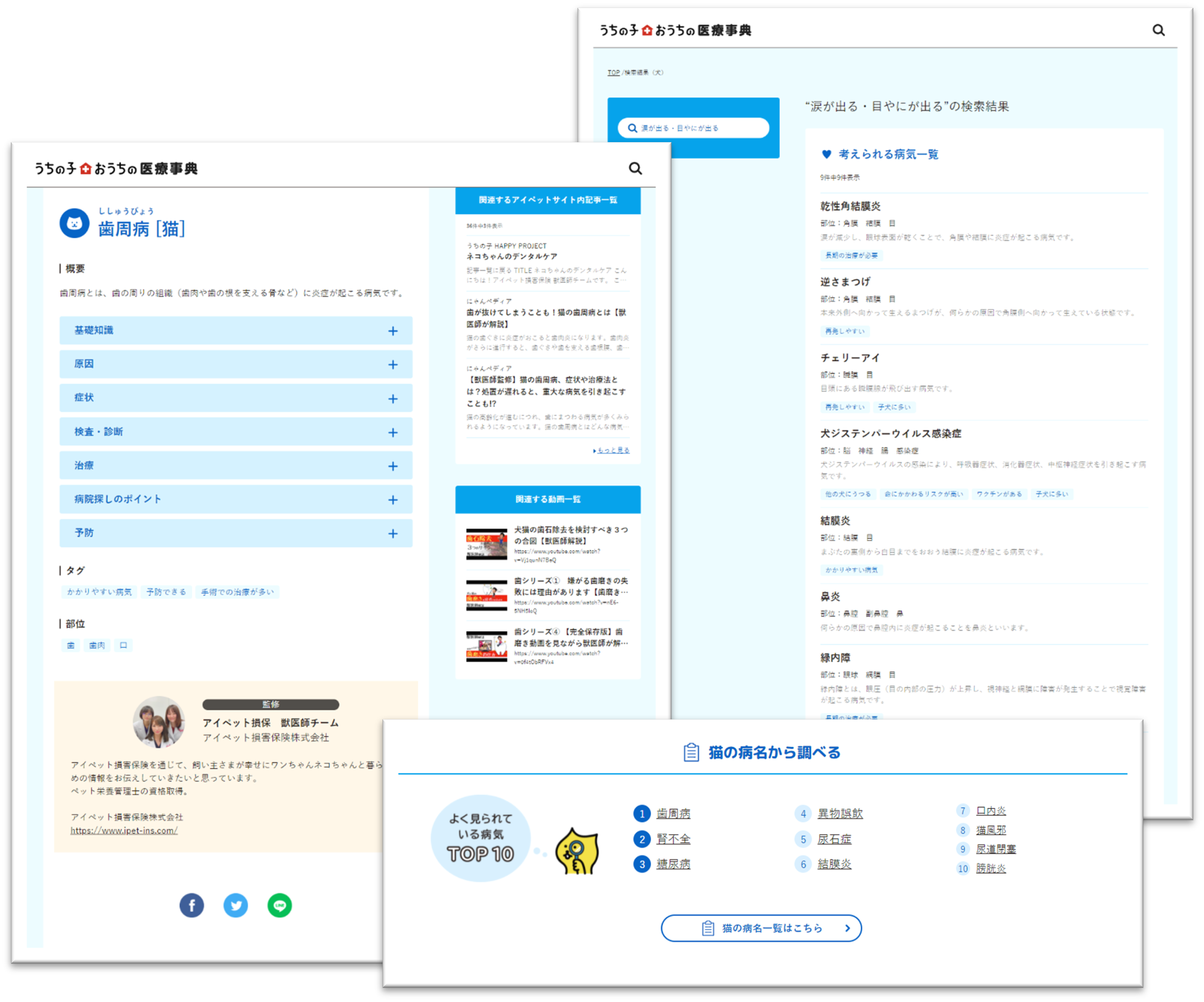 アイペット損害保険株式会社(本社:東京都港区、代表取締役 執行役員社長:安田敦子 以下、当社)は、2022年3月9日(水)より、犬・猫の病気や事故を未然に防ぐための対策を紹介する、獣医師監修の専門情報コンテンツ「うちの子 HAPPY PROJECT」上で、ペットのためのオンライン医療辞典『うちの子おうちの医療事典』を新たに公開しました。