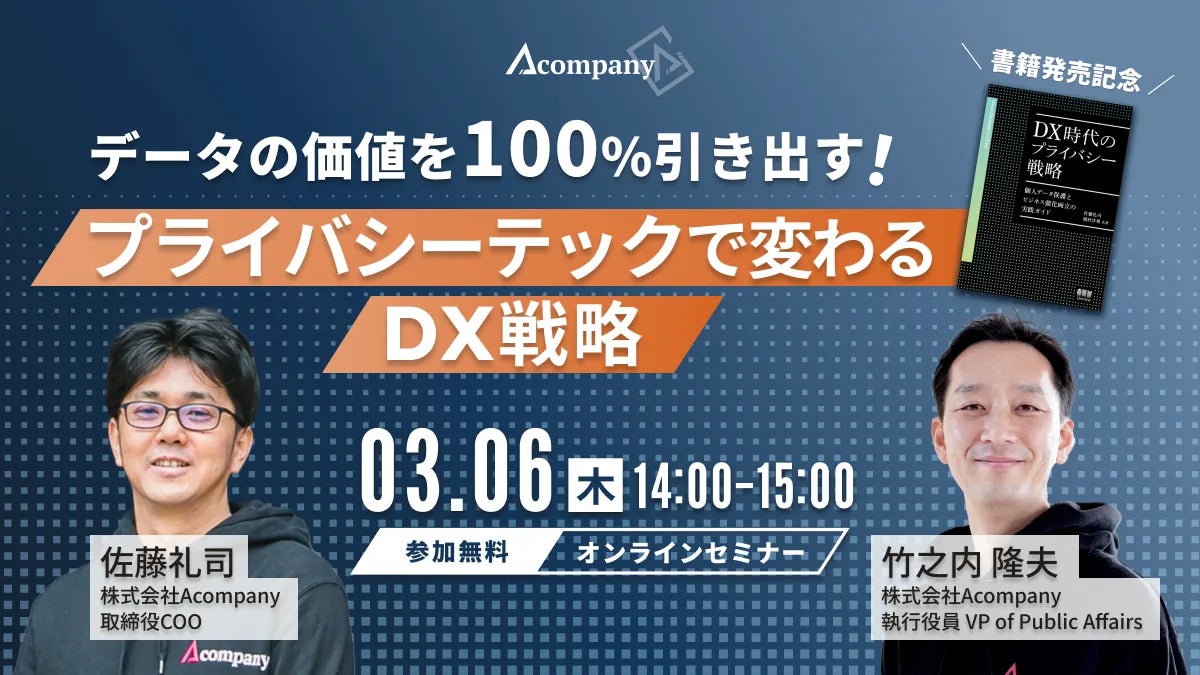 書籍「DX時代のプライバシー戦略 個人データ保護とビジネス強化両立の実践ガイド」発売を記念し、Acompanyは著者が登場するオンラインイベントを2回開催します。