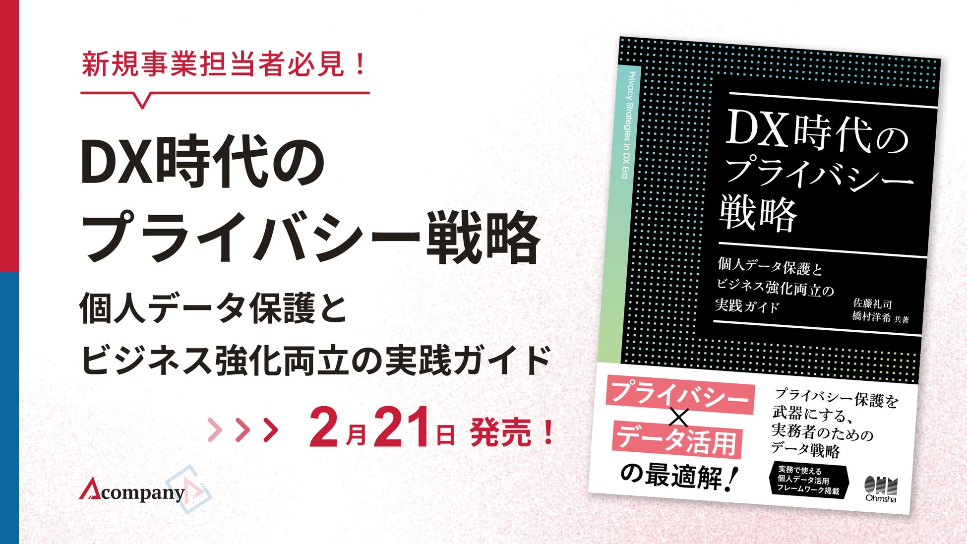 プライバシーDXを推進する株式会社Acompany(アカンパニー、愛知県名古屋市西区、代表取締役CEO 高橋亮祐、以下Acompany)は2025年2月21日(金)、書籍『DX時代のプライバシー戦略 個人データ保護とビジネス強化両立の実践ガイド』を株式会社オーム社より発売いたしました。 本書は、企業がDX(デジタルトランスフォーメーション)を推進するなかで直面する、個人データの保護とビジネス強化の両立という課題に対し、実践的なアプローチを提示する一冊です。最新のプライバシー法制解説や具体的なケーススタディ、ステップバイステップの実践ガイドを通じて、現場で役立つ知見を提供します。 なお本書はオーム社ウェブショップ、Amazon、楽天ブックス、または全国の書店などでご購入可能です。