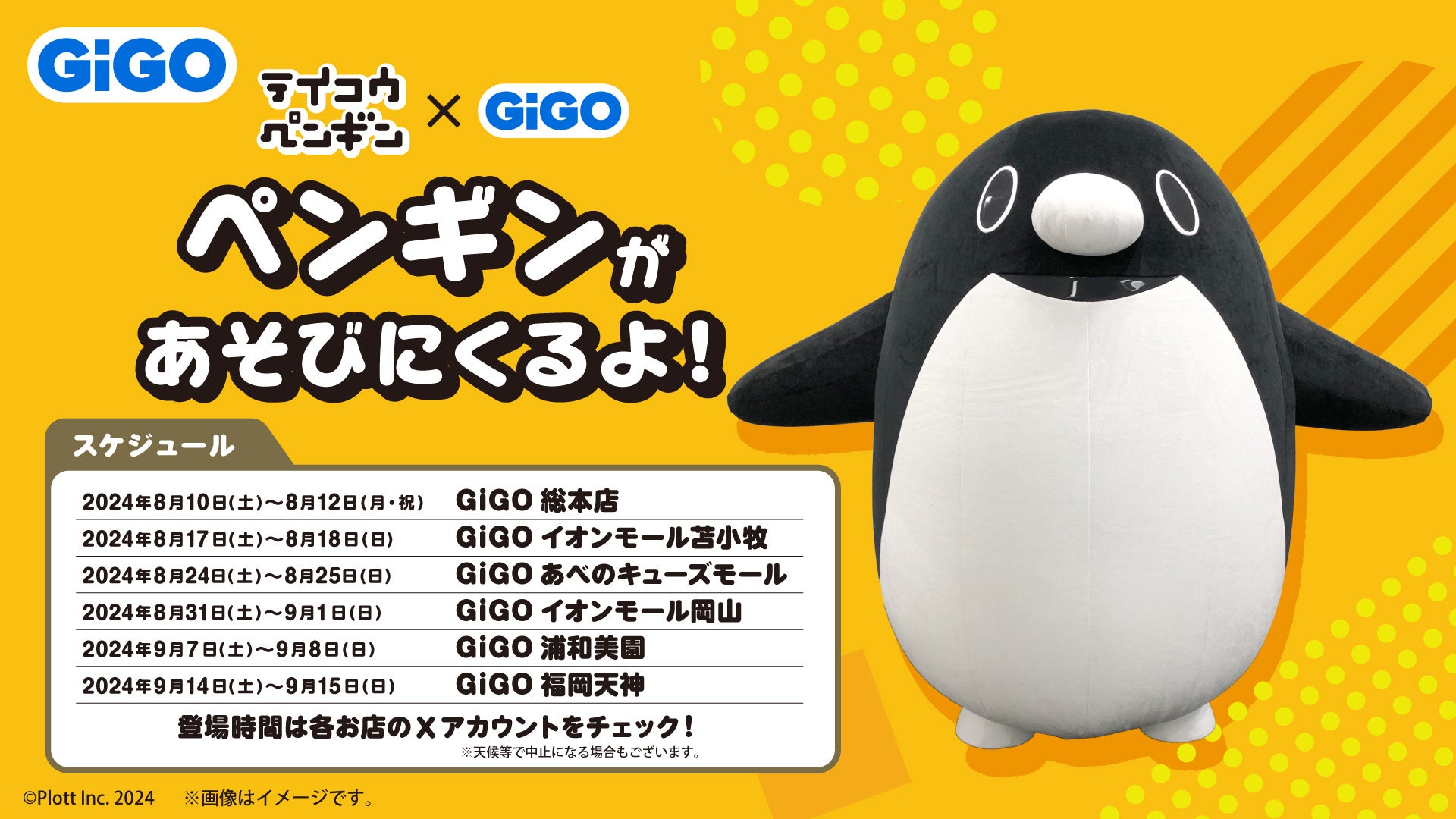 全国のGiGO6店舗にペンギンが出張します。登場時間につきましては各店舗公式Xで順次お知らせいたします。天候不良等により中止となる場合もございます。