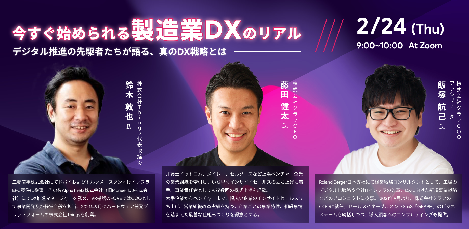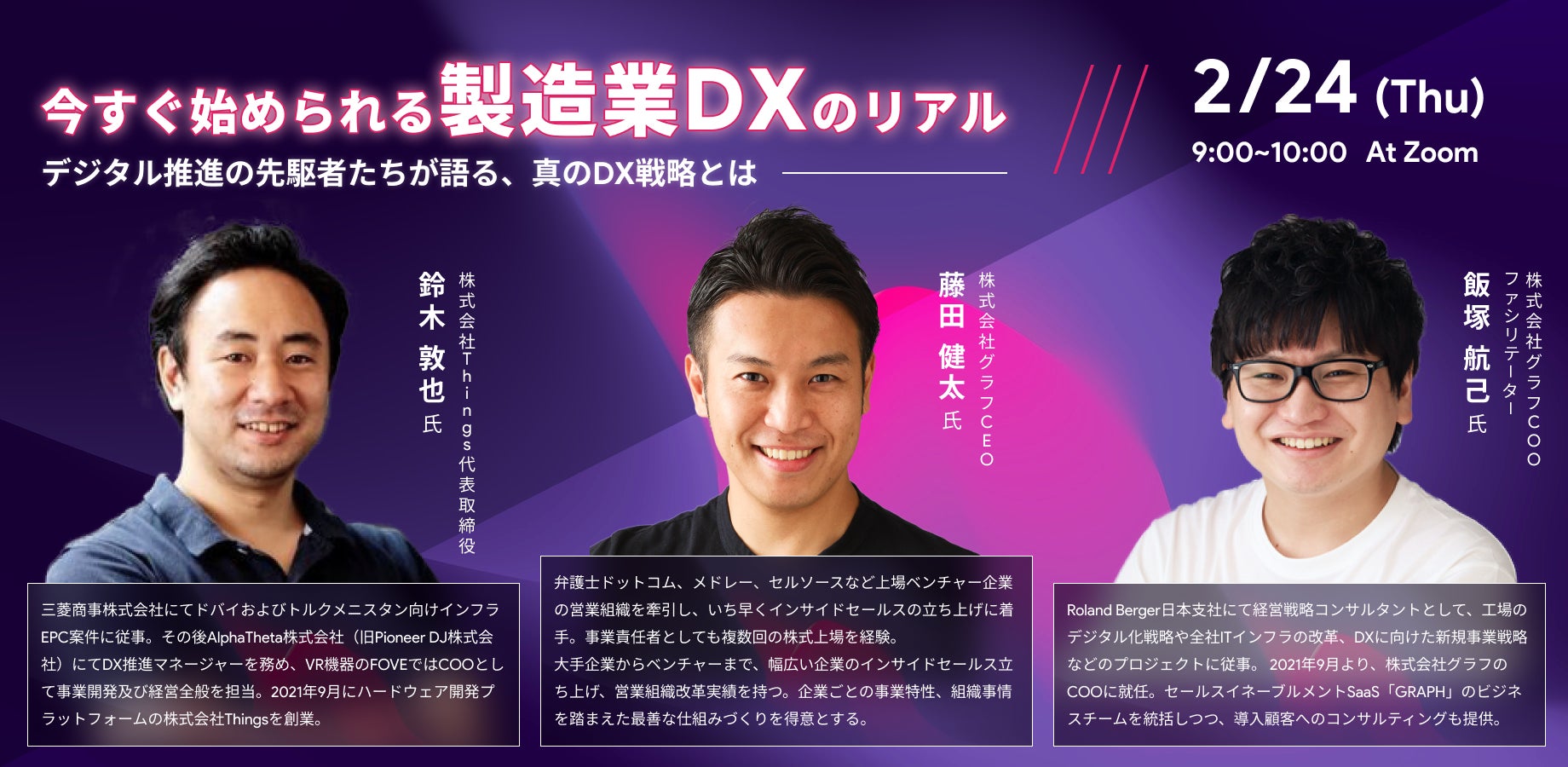 今回のウェビナーでは、海外のDX推進事業に参画し知見が豊富な鈴木氏、工場のデジタル化戦略や全社ITインフラの改革に従事した株式会社グラフの飯塚氏、データ活用プロの藤田氏をお招きします。製造DXを今すぐに始められるような基本的な知識から、具体的なツールなどリアルなお話を伺います。