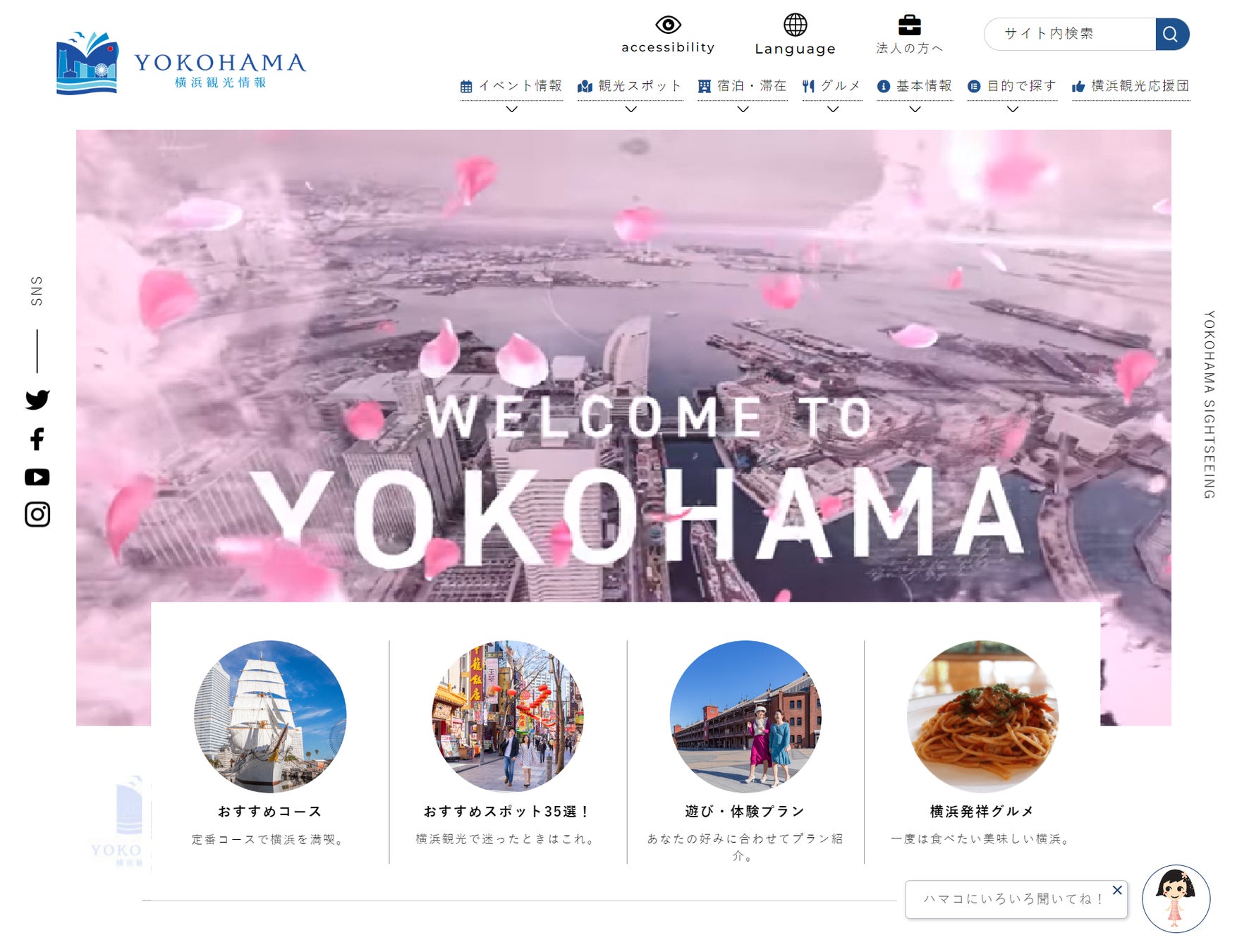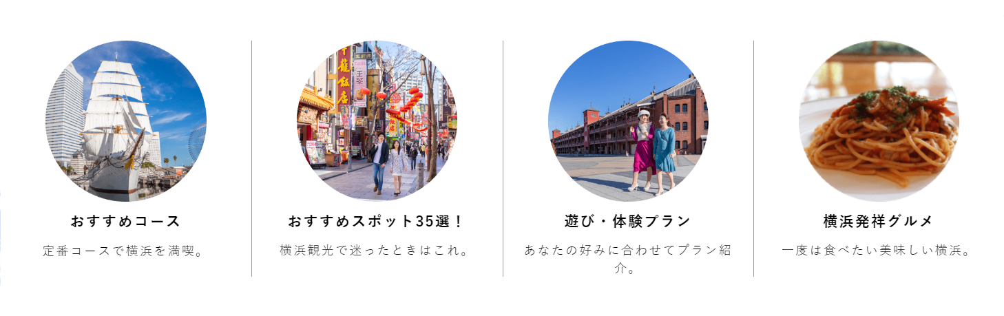 また、これまで蓄積してきたページを整理。横浜観光に初めて訪れる方にとってもわかりやすくなるよう、「おすすめコース」「おすすめスポット35選」「遊び・体験プラン」「横浜発祥グルメ」の4つを大きなボタンを設置し、求めている情報へたどり着きやすい設計にリニューアルしました。