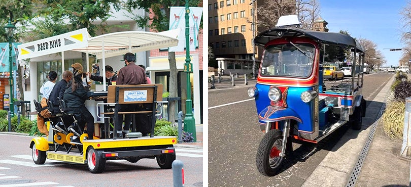 現在は、6月11日(日)まで市内各所で開催している、花をテーマにまちの地域資源をつないで横浜の魅力を体験できる「花咲く Rally」と連携し、横浜らしい景色を感じながら移動そのものを楽しめる乗り物、オランダ発祥の移動式ビアカウンター「ビアバイク」や、東南アジアを中心に普及している「トゥクトゥク」を使った、ガイド付きのツアーを販売しています。