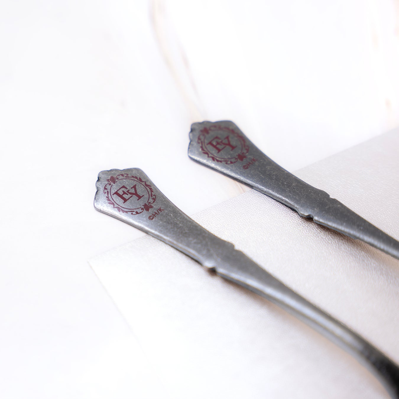 フォークとスプーンともに、柄の部分にイニシャルロゴ(EY)をあしらいました。