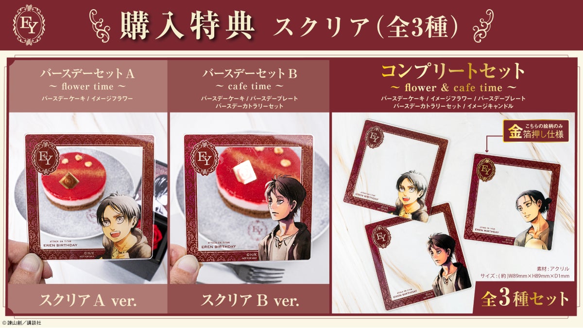 「エレン バースデーコンプリートセット ~ flower&cafe time ~」には、スクリア全種セット(A ,B ,C)
