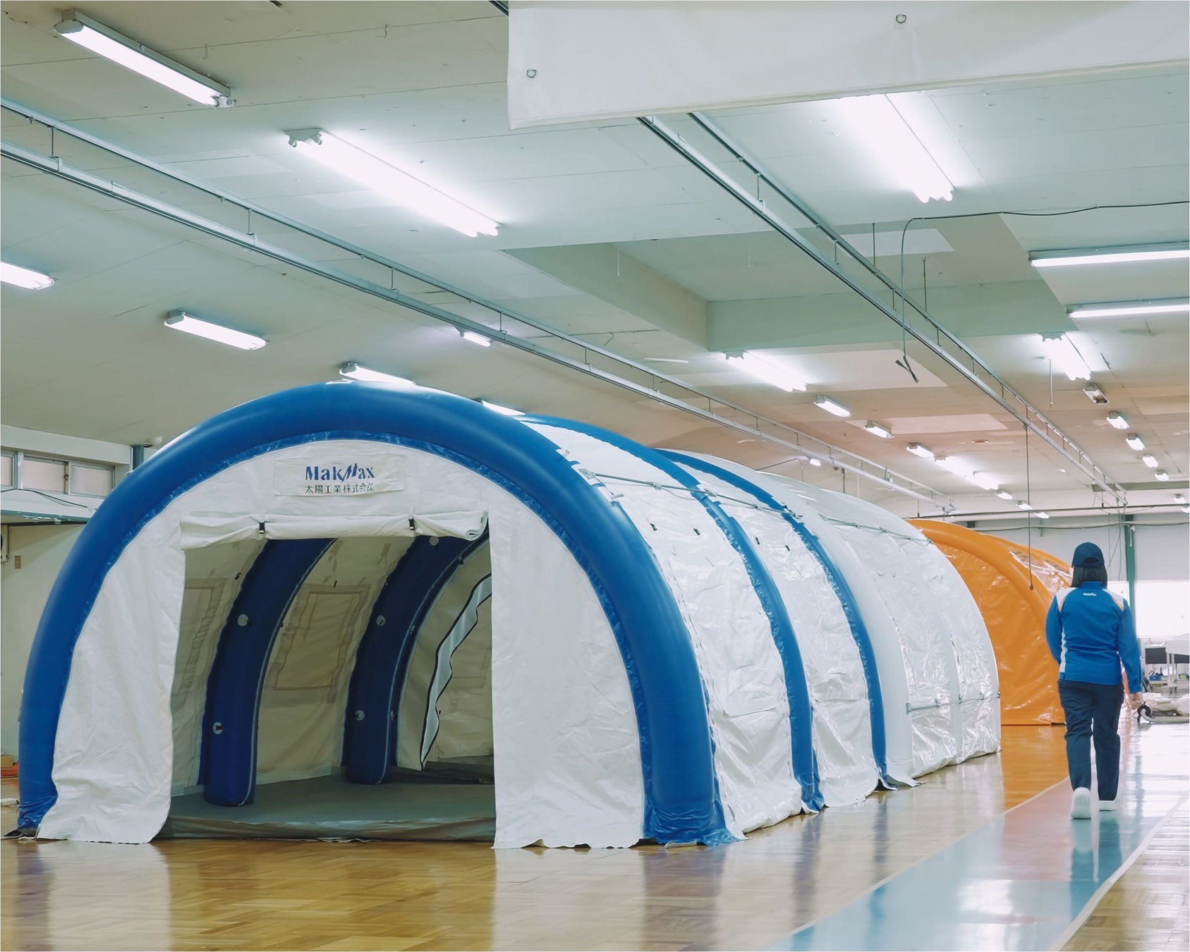 太陽工業では、2025年4月に開幕した大阪・関西万博で20ヶ所以上のパビリオン設営に協力し、大型膜面構造物を施工しています。今回の実験で使用したエアーテント「マク・クイックシェルター」は、東日本大震災や令和6年能登半島地震など、災害時の医療用途などを含めて2700張り以上の活用実績があります。今後「マク・クイックシェルター」の大型化などのニーズを分析して、自走式ファスナーの本格的な活用を提案していく計画です。また、太陽工業が展開している大型エアシェルター「BIG MQ」(ビッグエムキュー、右写真)での活用や、将来的には宇宙空間での活用なども視野に入れて開発協力を続ける予定です。