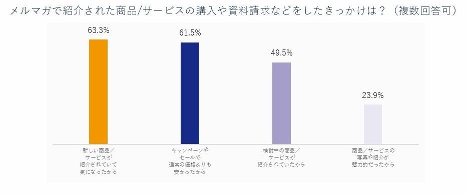 BtoB商材のメルマガに関して、メルマガで紹介された商品/サービスの購入や資料請求などをしたきっかけを質問しました。最も多い回答が「新しい商品/サービスが紹介されていて気になったから」で63.3%、次点が「キャンペーンやセールで通常の価格よりも安かったから」で61.5%となりました。