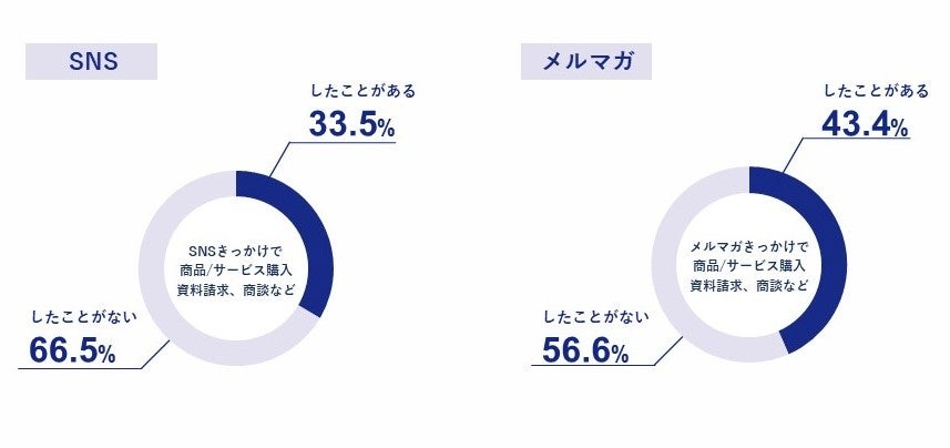 SNSがきっかけでBtoB商材の購入・資料請求・商談などを「したことがある」と回答した人は33.5%で、メルマガのほうが10ポイントほど高い結果となっています。
