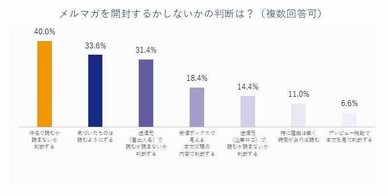 メルマガを読むかどうかの判断は、「件名で読むか読まないか判断する」と回答した人が最も多く40.0%となっています。