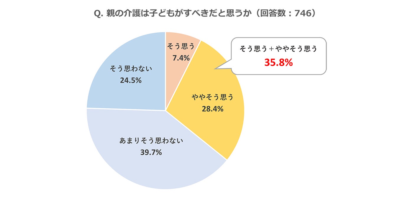 たとえば「親の介護は子どもがすべきだと思うか」という質問に対する回答は、「そう思う」が7.4%、「ややそう思う」が28.4%、「あまりそう思わない」が39.7%、「そう思わない」が24.5%となっており、「親の介護は子どもがすべきだ」と考えている人はケアラーの中でも少数派であることがわかります。