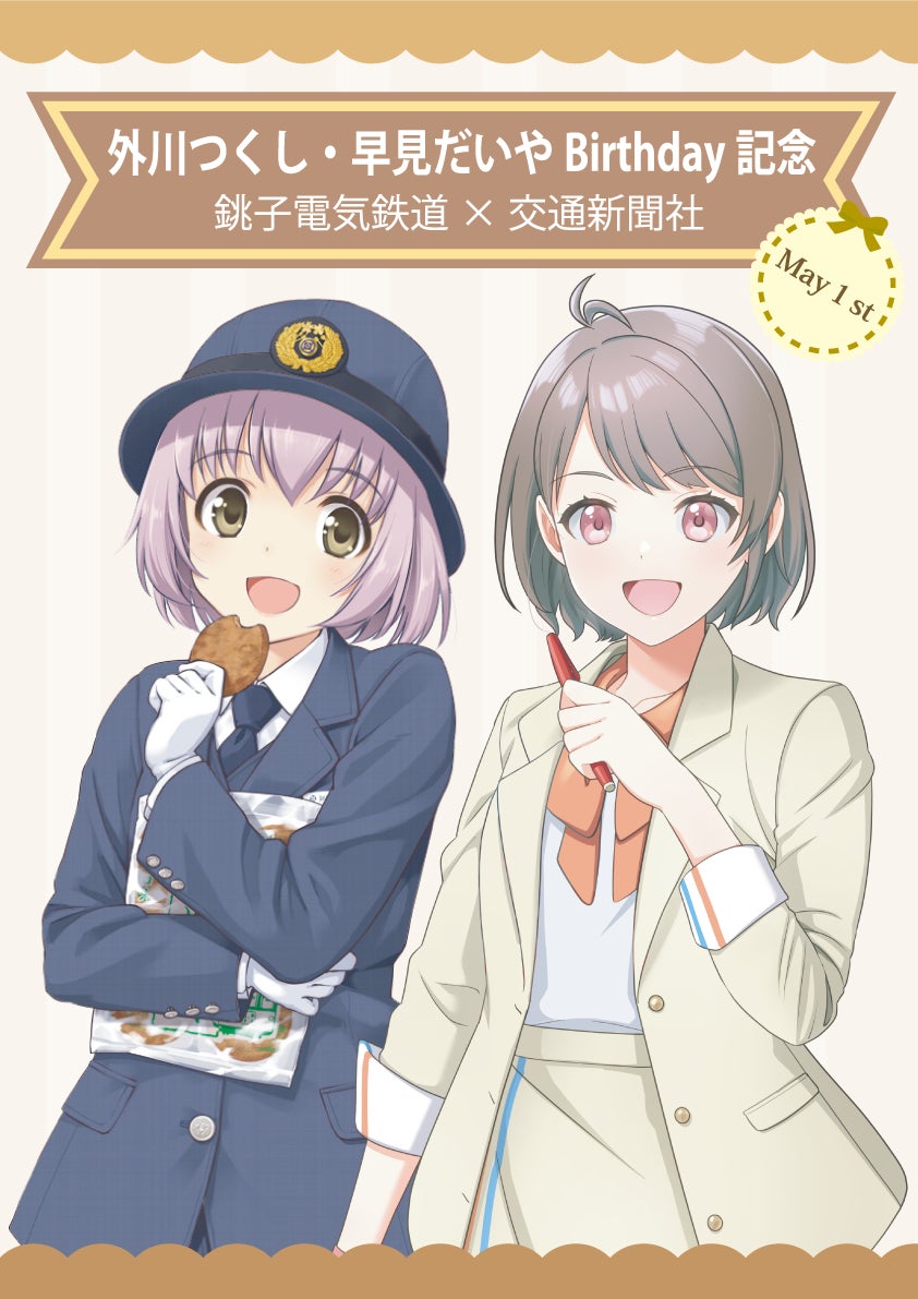 銚子電気鉄道株式会社の鉄道むすめ 「外川つくし」と、株式会社交通新聞社の鉄道むすめ「早見だいや」が、5月1日に誕生日を迎えることを記念して、「外川つくし」&「早見だいや」バースデーコラボ企画を開催します。