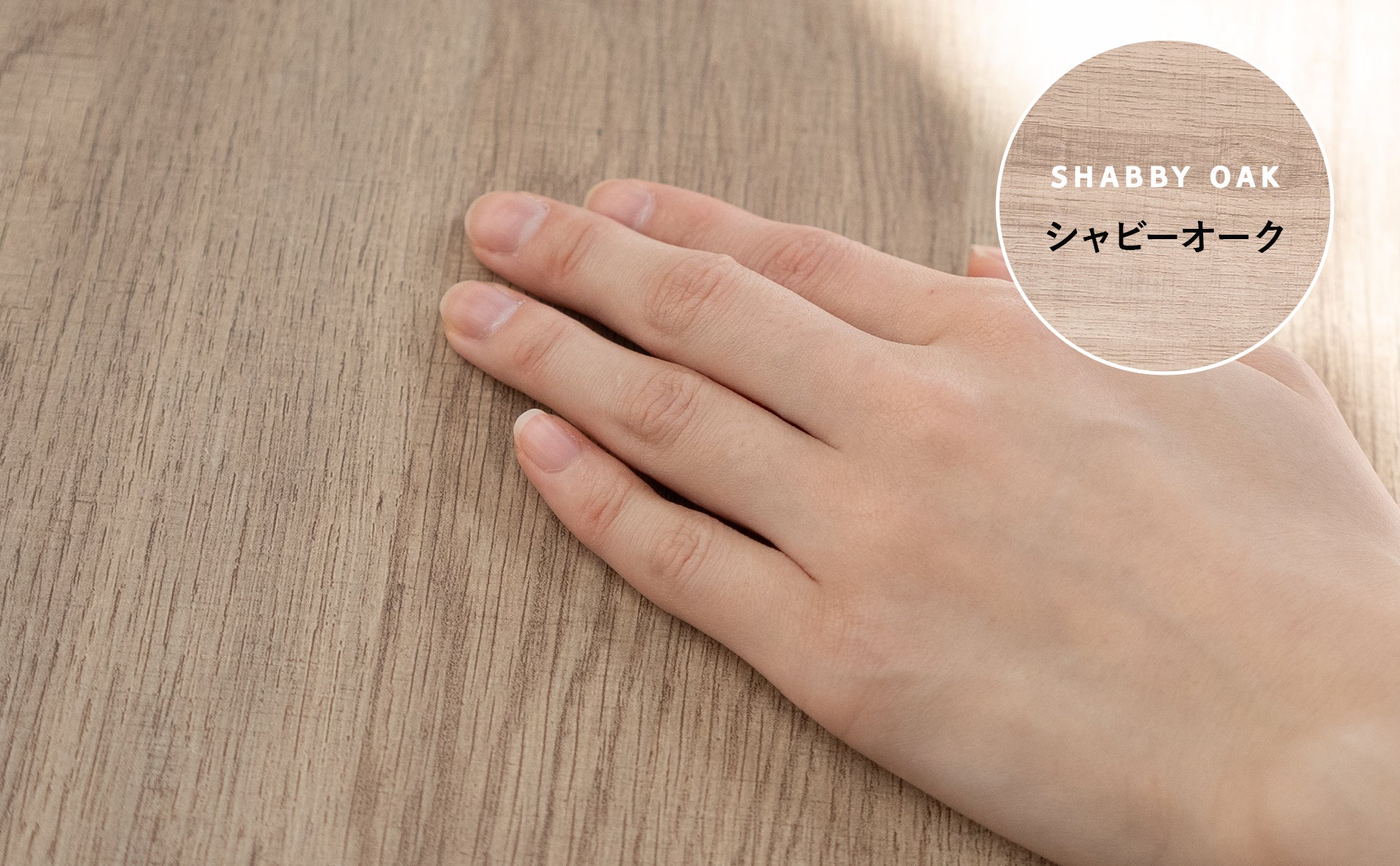 天然オークの魅力を再現した美しい木目と質感が、上質なナチュラル空間を演出します。メラミンシート仕上げで水や汚れに強く、日々のお手入れも簡単です。立体感があり自然な木目を手触りでも楽しんでいただけます。