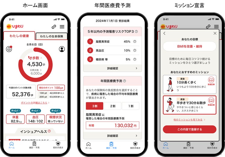 健康診断結果を登録後に提示される予測罹患率の高い疾病に罹患した場合、どのくらいの年間医療費がかかるのかを確認できる「年間医療費予測」と、お客さま自身が次回の健康診断までに改善・維持したい目標を設定いただくことで、目標達成に向けて手軽に実施しやすい健康行動を提案する「ミッション宣言」を2024年12月中旬にリリース予定です。将来的には、健康診断結果の登録や歩行以外の健康行動を実施することによるポイント付与を予定しています。MYひまわりの更なる進化にご期待ください。