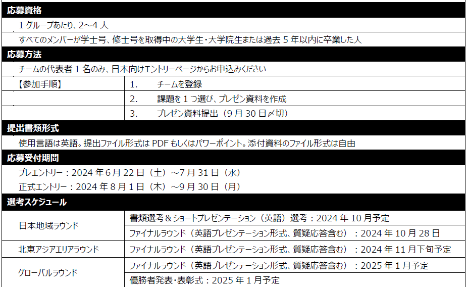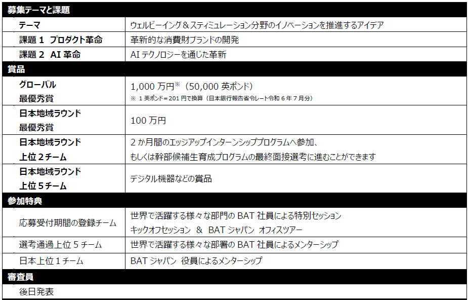 受付期間中に登録を行ったチームは、世界で活躍する様々な部門のBAT社員による特別セッションや、今回の課題や応募方法などについて質問できるキックオフセッション、およびBATジャパンオフィスツアーに参加することが可能です。また、書類選考を通過したチームには、グローバルビジネスの経験豊富なBATジャパンの社員・役員が、プレゼン資料のブラッシュアップを手助けするメンターシップを実施します。