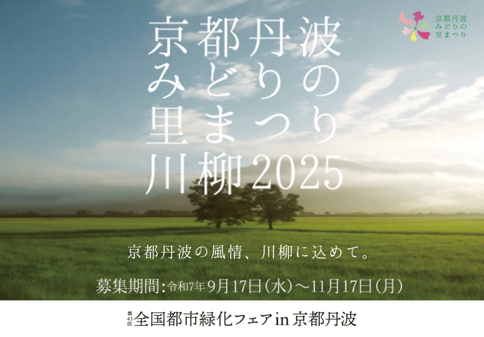第43回全国都市緑化フェアin京都丹波実行委員会(会長:桂川孝裕・亀岡市長)は、2026年9月18日から11月8日にかけて開催される「第43回全国都市緑化フェアin京都丹波」の開催に向けた機運醸成を目的に、京都丹波地域の魅力を詠んだ川柳を募集する『京都丹波みどりの里まつり川柳2025』を実施します。募集期間は2025年9月17日(水)から11月17日(月)までで、全国のどなたでも応募可能です。優秀作品には、京都丹波の特産品を副賞として贈呈します。