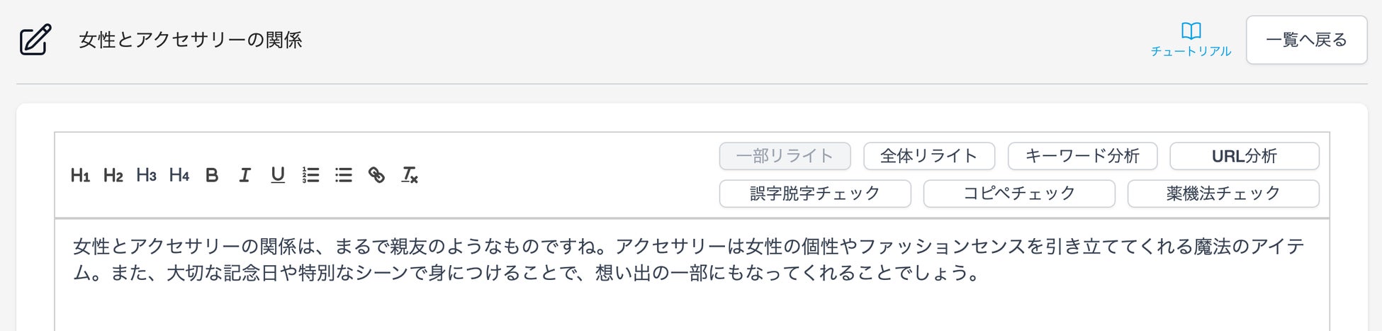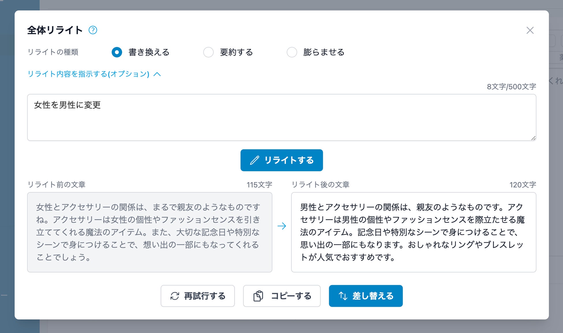 上記のご意見をうけて、文章全体のリライトをカンタンに行うことができる機能を開発することに成功いたしました。