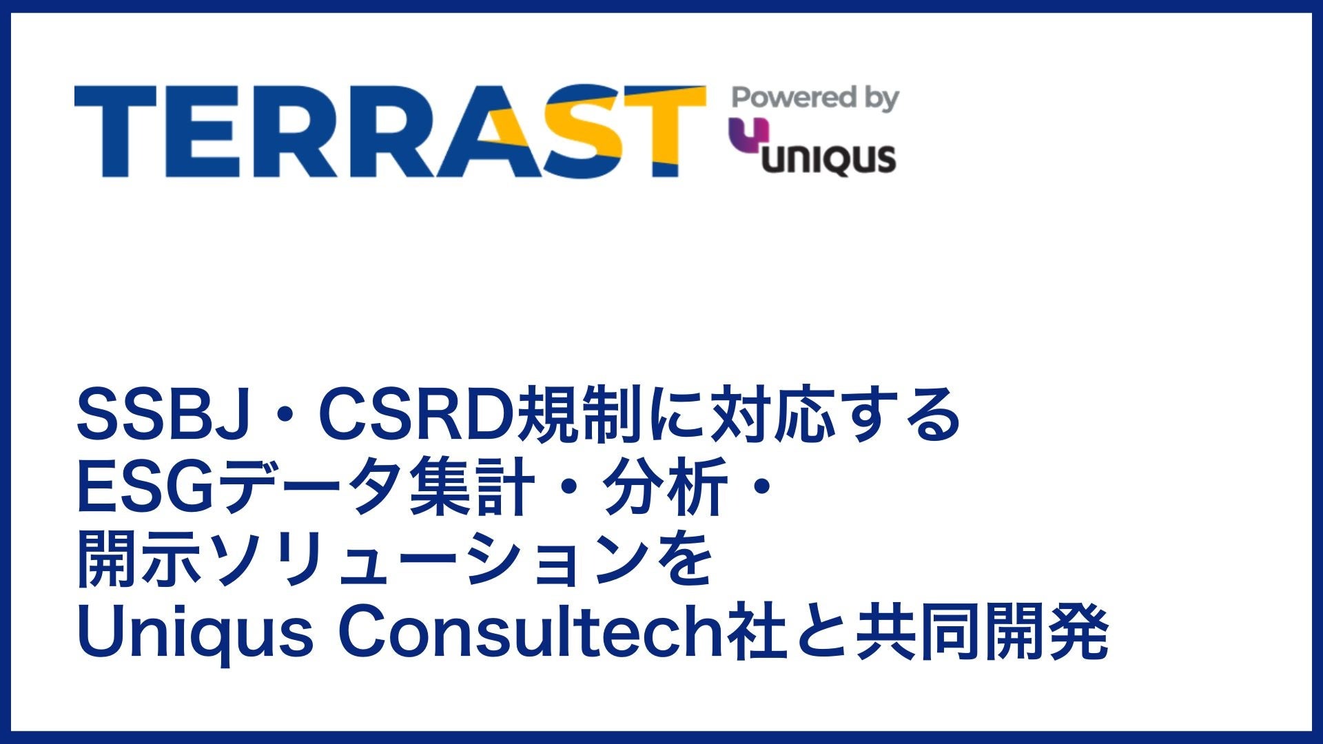 本ニーズに対応するため、S&P500銘柄企業をはじめとするグローバルカンパニーに導入実績を持つUniqus Consultech社と共同開発を行い、日本企業向けに、SSBJ・CSRD規制に対応するESGデータ集計・分析・開示ソリューション「TERRAST powered by Uniqus」を開発・リリースいたしました(一部機能については継続的にアップデートを予定)。