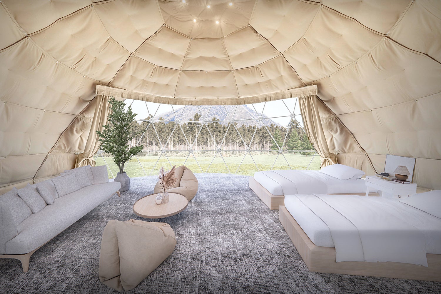 豊かな大自然を一望する広い敷地に、「かまくら」スタイルのドーム型テントを2棟配置。直径7m・天井も高く広々とした室内には冷暖房が完備されており、かわいいインテリアでコーディネート。