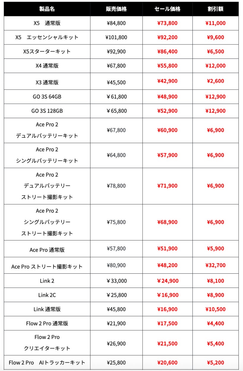 本セールでは、最新の360度全景カメラ「X5」や大人気のポケットサイズの4Kアクションカメラ「GO 3S」、8Kアクションカメラ「Ace Pro 2」をはじめとした製品を、特別価格でご提供いたします。期間中はアクセサリー10%お得に購入できます。