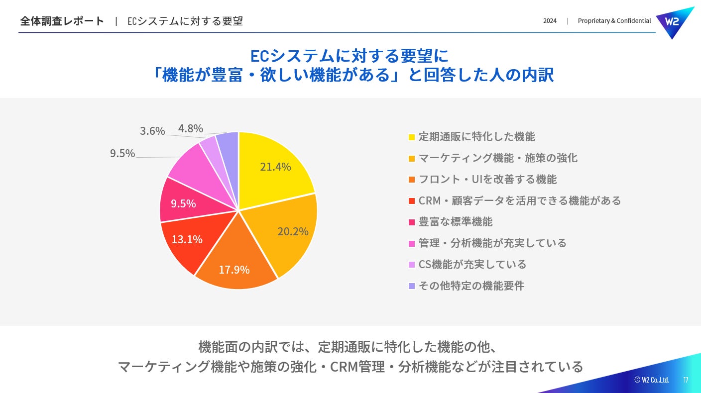 回答内訳から、多い順に「定期通販に特化した機能」「マーケティング機能・施策の強化」「フロント・UIを改善する機能」が求められていることが分かった。