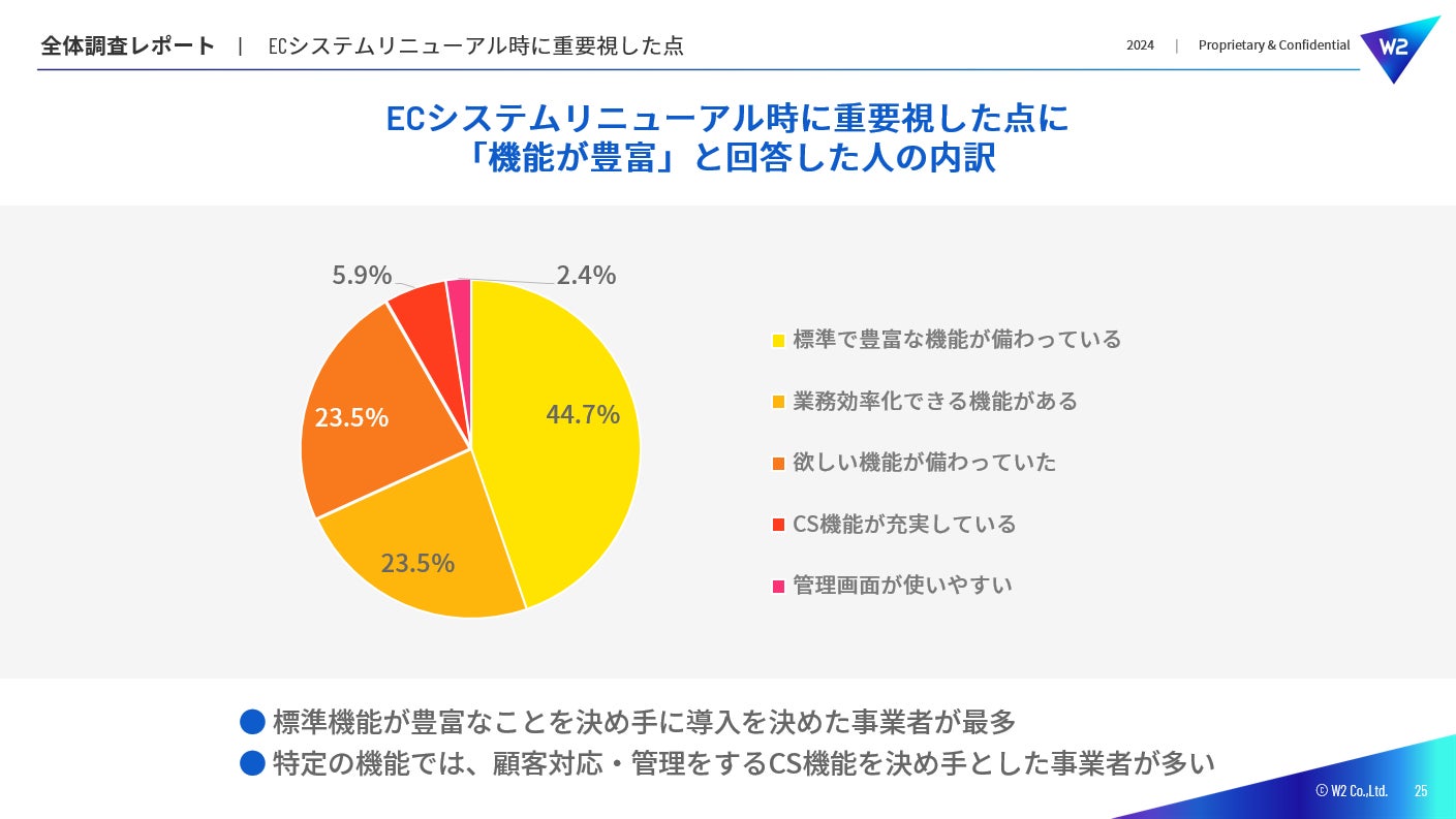 Q2「ECシステムに対する要望は何ですか?」という質問に対し、「機能が豊富・欲しい機能があり」と回答した事業者の回答内訳