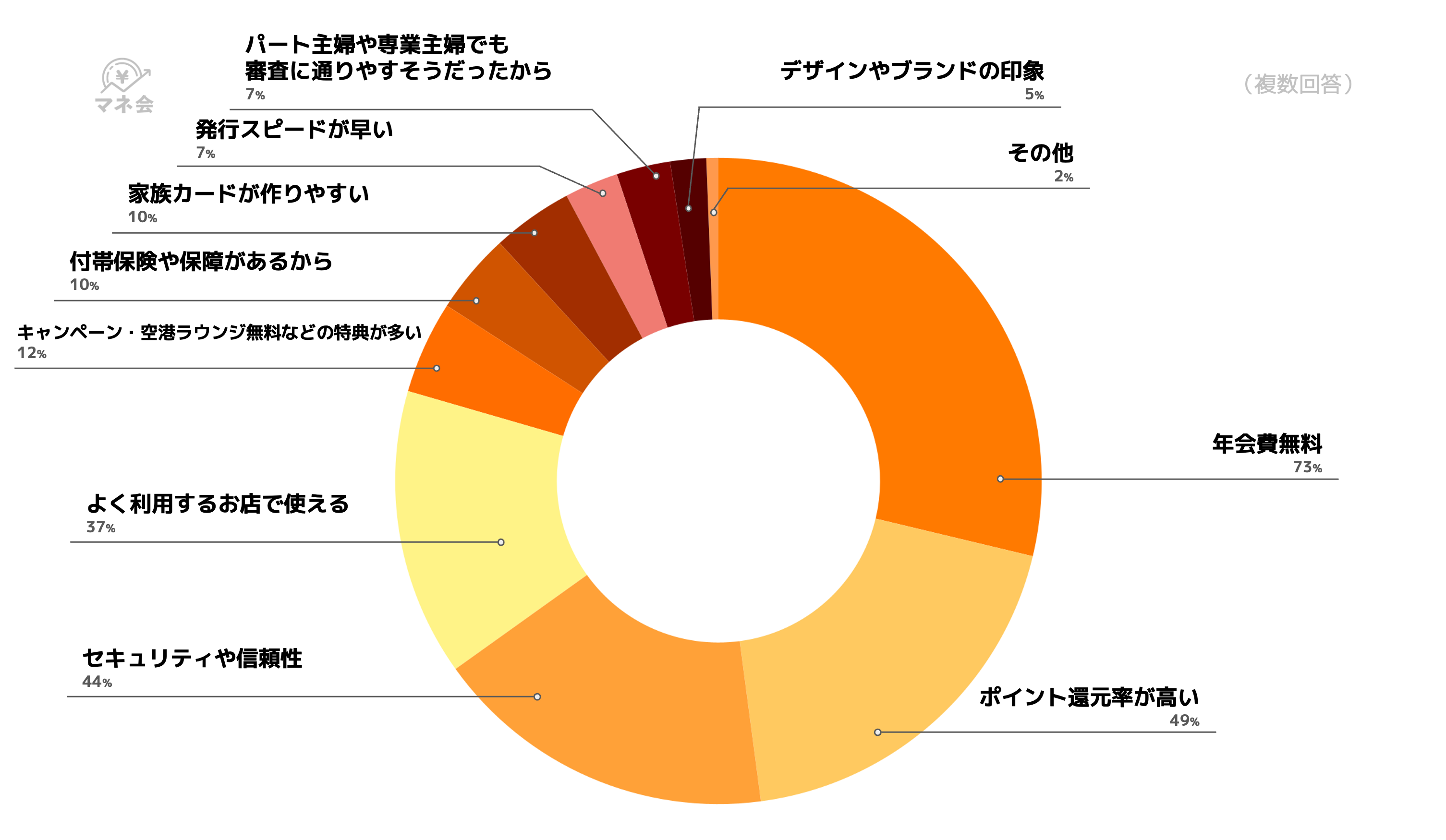 1.カード選びで最も重視されたのは「年会費無料」73%、「ポイント還元率」49%、「セキュリティ・信頼性」44%