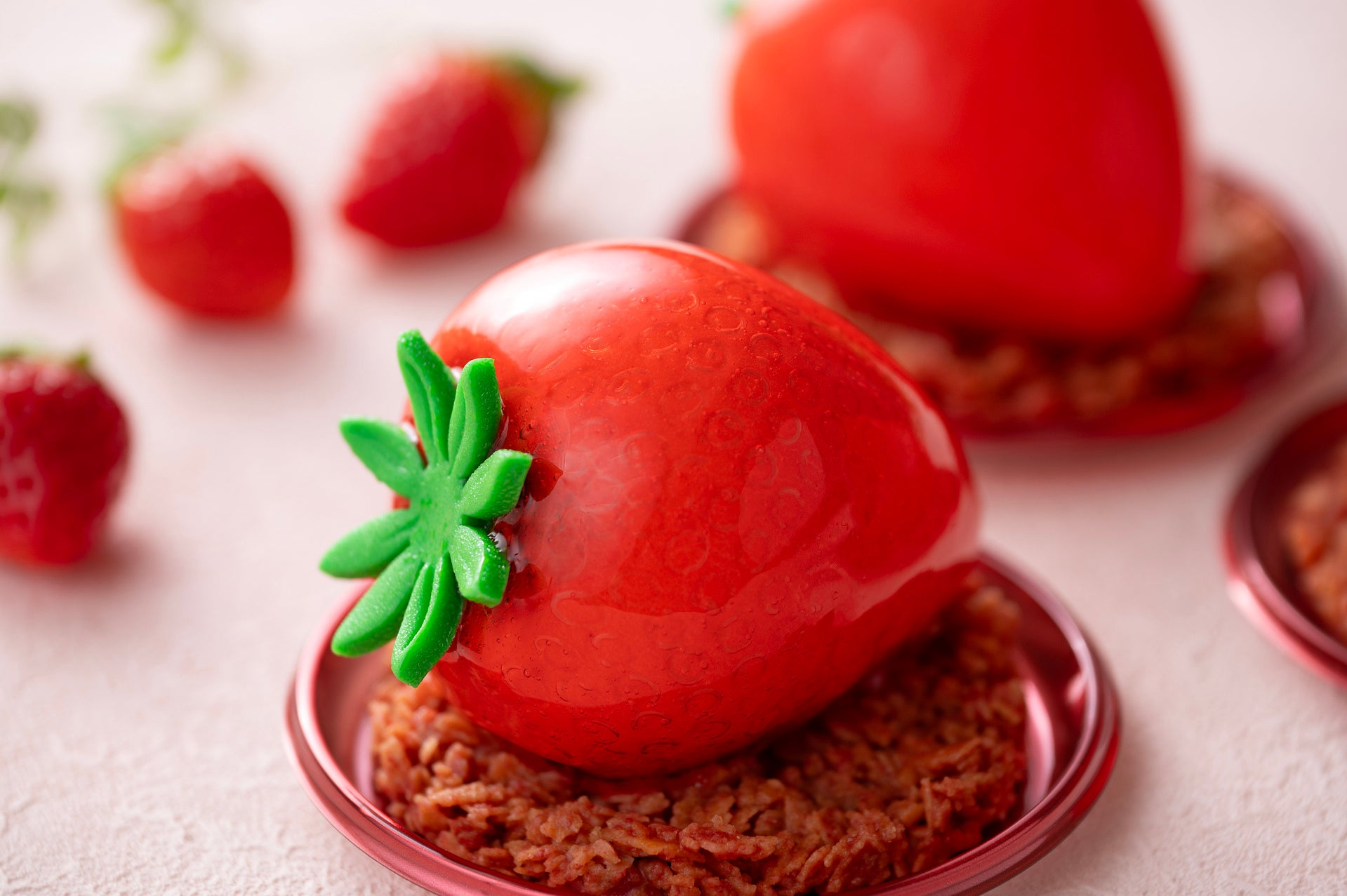 苺レアチーズの中にはピスタチオのムースを閉じ込め、ボトムは苺のクランチショコラ。キュンと心ときめく 苺好きのための苺の形のケーキです。