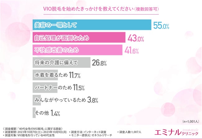 そこで今回、医療脱毛を手掛けるエミナルクリニック(https://eminal-clinic.jp/lp01/?refmedia=11073)は、VIO脱毛を行っている40代女性を対象に、「40代から始めるVIO脱毛」に関する調査を実施しました。