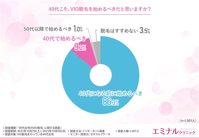 「40代こそ、VIO脱毛を始めるべきだと思いますか?」と質問したところ、『40代になる前に始めるべき(86.3%)』と回答した方が最も多く、次いで『40代で始めるべき(9.2%)』『脱毛はすすめない(3.5%)』『50代以降で始めるべき(1.0%)』と続きました。