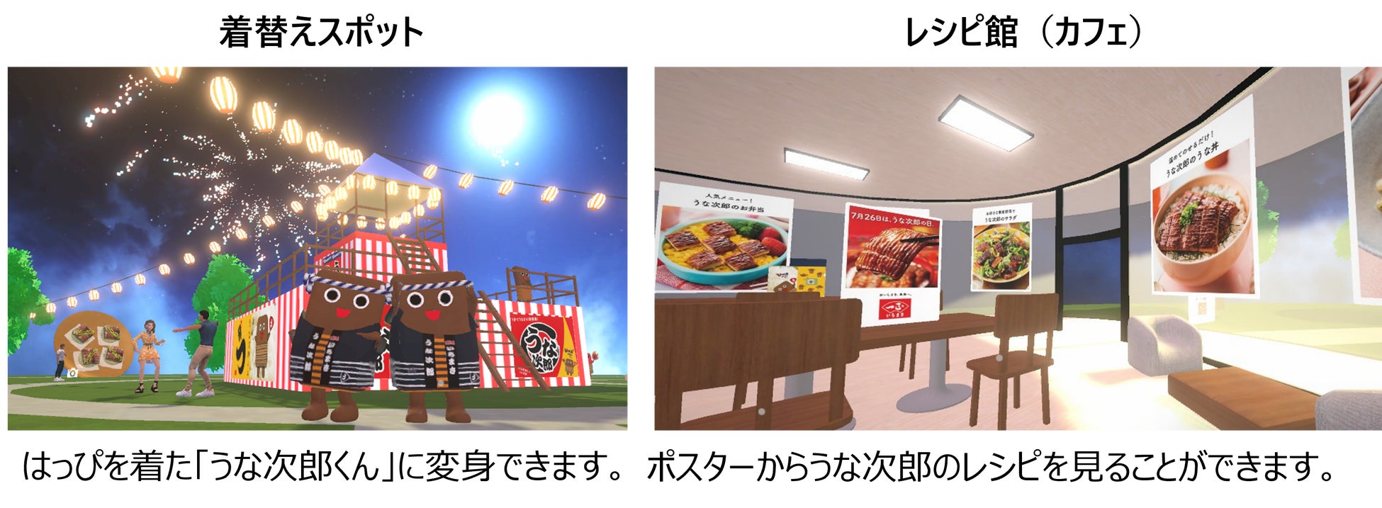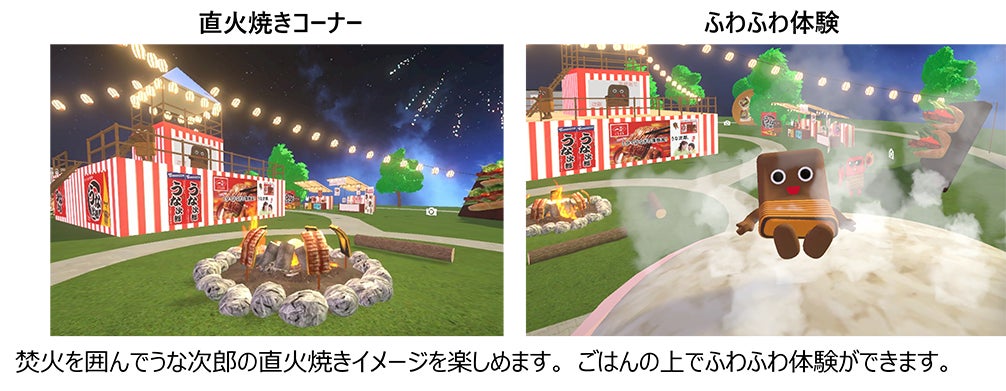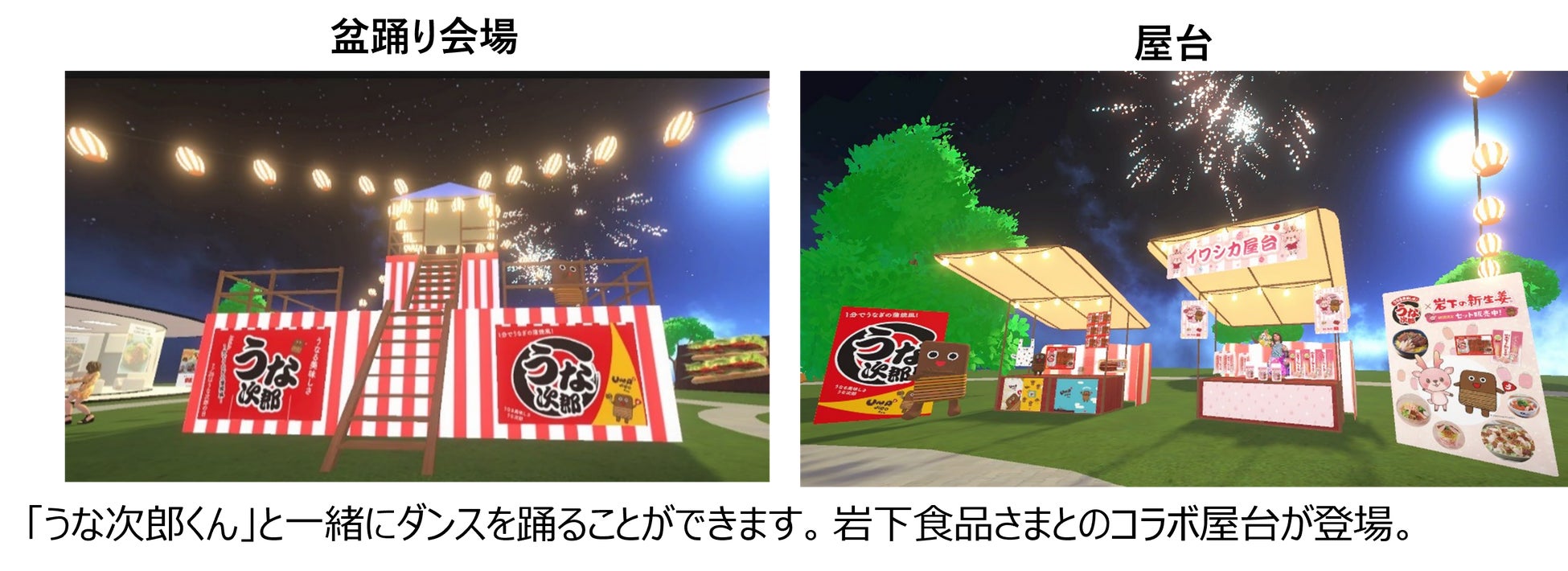 今年の夏は、「岩下の新生姜®」でおなじみの岩下食品さまとコラボレーション。岩下の新生姜公式キャラクター「イワシカ®」ちゃんが、可愛い3Dアバターとなって登場!「うな次郎くん」もはっぴ姿で皆さまをお迎えします。ワールドの中央には櫓や、うな次郎くんや「イワシカ®」ちゃんに変身できるコーナーのほか、直火焼き焚き火コーナー、ごはんの上でふわふわ体験コーナー、レシピ館など「うなる美味しさ うな次郎」の美味しくて楽しい世界をたっぷりお楽しみいただけます。また、ワールド内の縁日の屋台には、うな次郎関連はもとより、岩下の新生姜やコラボグッズが飾られている屋台を設置。それぞれのオンラインショップへ遷移し、実際に商品を購入いただけます。