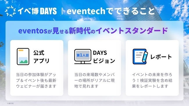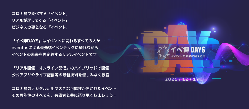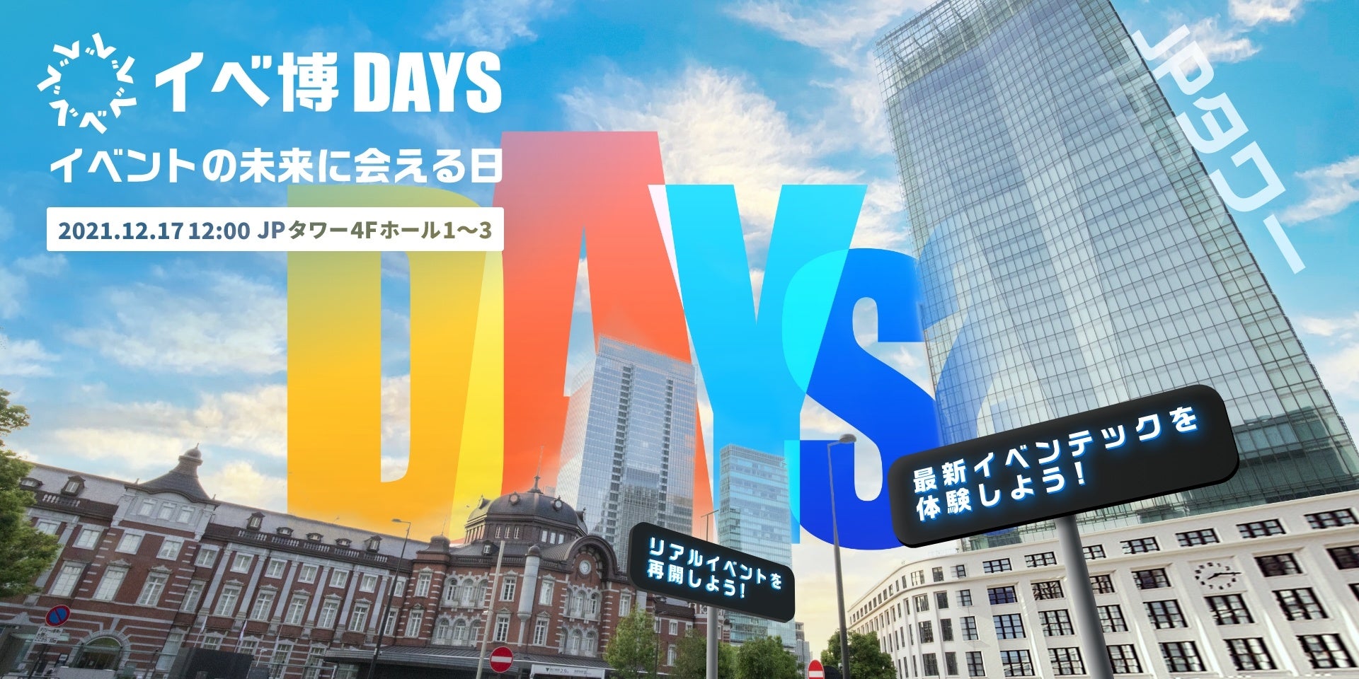 今日、新型コロナウイルス対策に向けたワクチン接種が進み、感染者も減少の一途を辿る中、イベントを通してこれからの経済を活性化する必要性を、eventechを事業としている我々の責務と考え、従来のライブ配信によるイベ博と一線を画したイベント関係者が集まるリアルイベントとして「イベ博DAYS」を開催する運びとなりました。