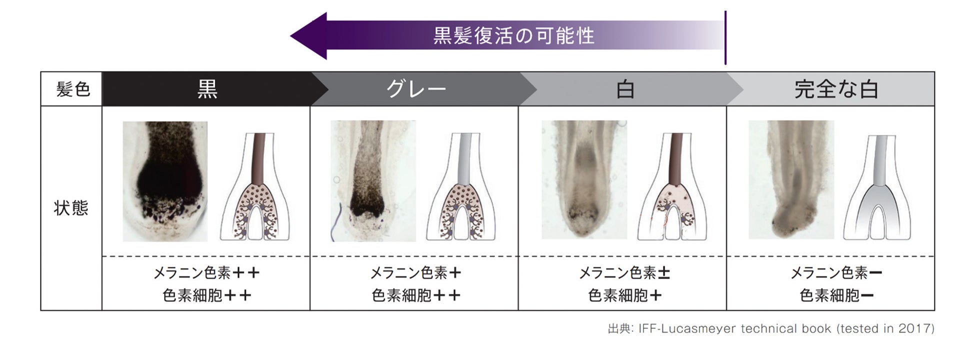 髪の色はメラニン色素によって決定されており、このメラニンはメラノサイトと呼ばれる細胞から供給されています。メラノサイトは毛包のバルジに存在する“色素幹細胞”から生み出されます。加齢やストレスなどによって色素幹細胞の数が減ってしまうと、メラノサイトが生み出されなくなりメラニンの供給が不足し、白髪になることが分かっています。