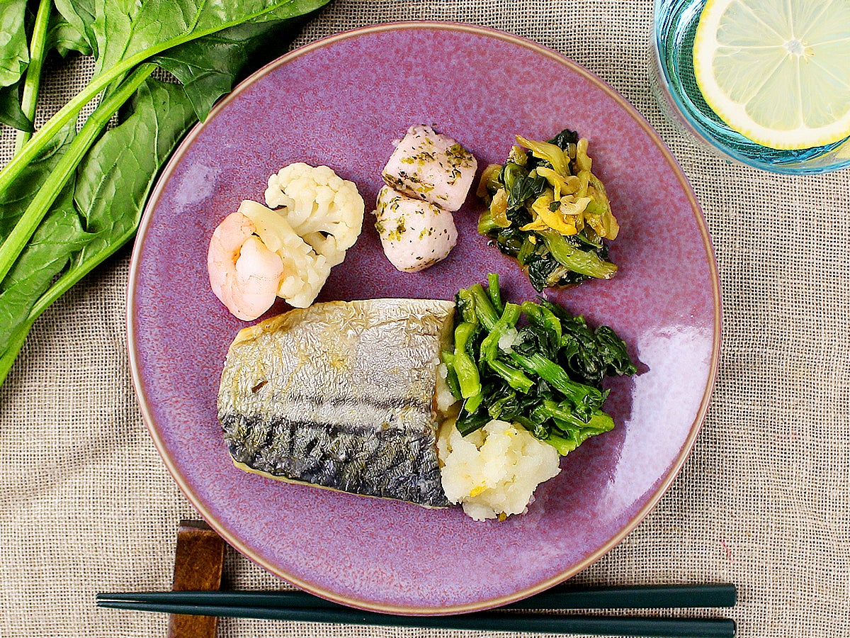 和食の定番であるさばの塩焼きに大根おろし、菜の花を添えてあっさりとしたプレートをご用意しました。大根おろしには国産のきざみ柚子を混ぜており、さっぱりとお召し上がりいただけます。さばは体内で合成できない必須脂肪酸であるDHAやEPAなどが豊富で、良質なたんぱく質も含まれています。また大根には様々な消化酵素が含まれており、魚のたんぱく質や脂質の消化を助ける働きがあります。