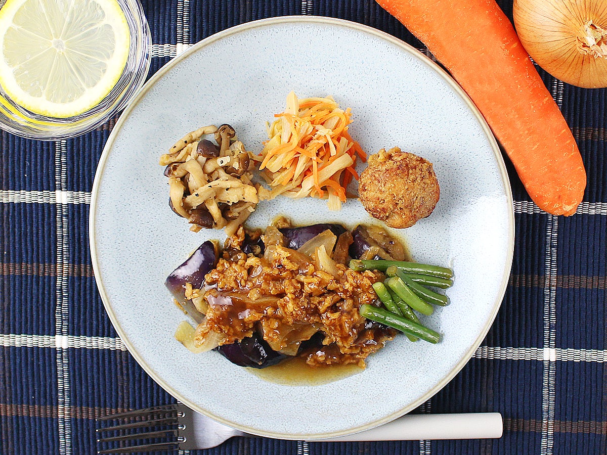 茄子がメインとなったベジプレートをご用意しました。お肉のミンチではなく、大豆ミートを使用することで脂っこいしつこさがなくさっぱりとした舌ざわりとなっております。味付けはナッシュオリジナルの黒酢あんにアクセントとなる山椒がガツっと効いています。