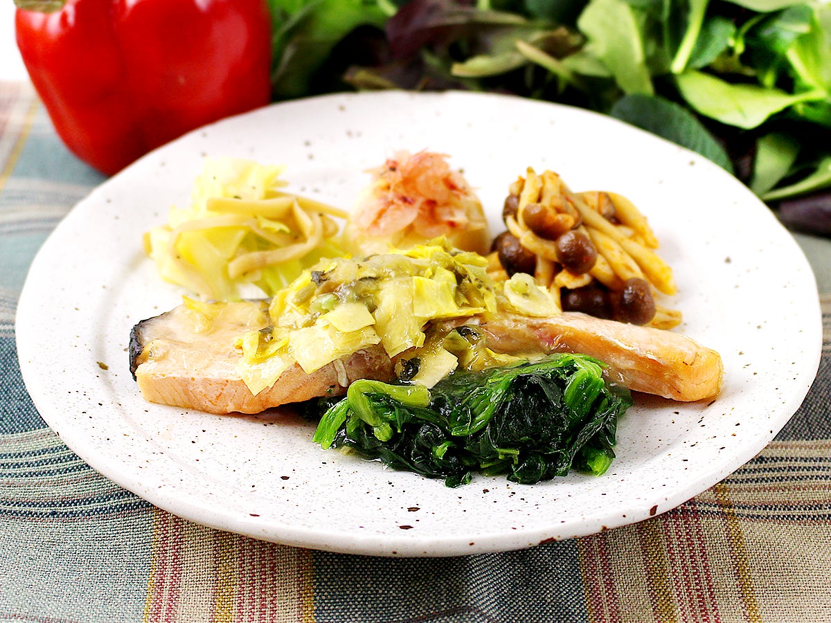 高菜漬け、搾菜、湯葉を使用したあんかけで、あっさり塩味が効いた優しい味わいの魚料理に仕上げました。中国語で塩味の漬物は鹹菜(シェンツァイ)と表し、そのまま食べるだけでなく、料理の味付けにも使用されます。鮭の下に敷いてある小松菜には、鮭の旨味と高菜等の程よい塩味が染み込んでおります。