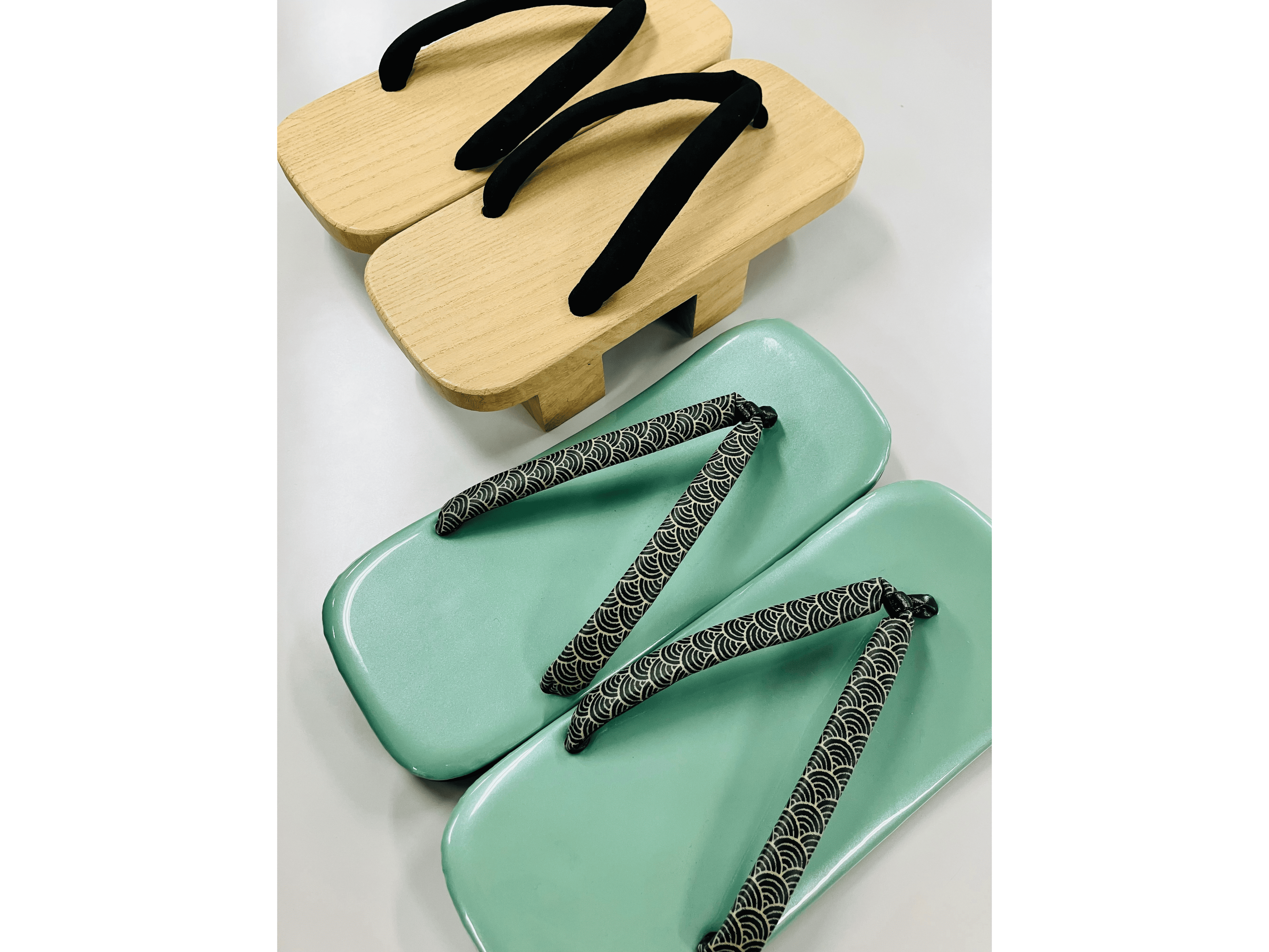 雪駄は竹皮を編んだ畳表に革などを縫い合わせたもの、下駄は木製です。ともに力士の普段用の履物で、序二段以下の力士は下駄を履いています。
